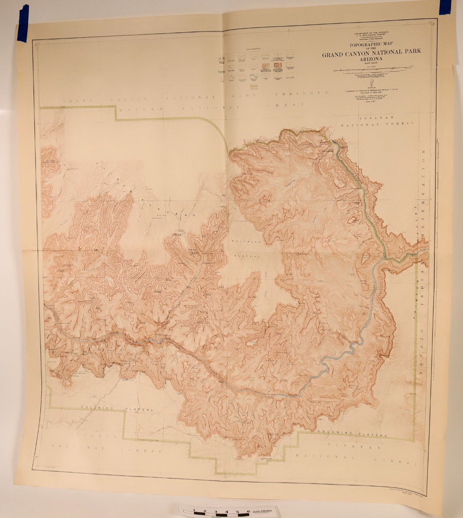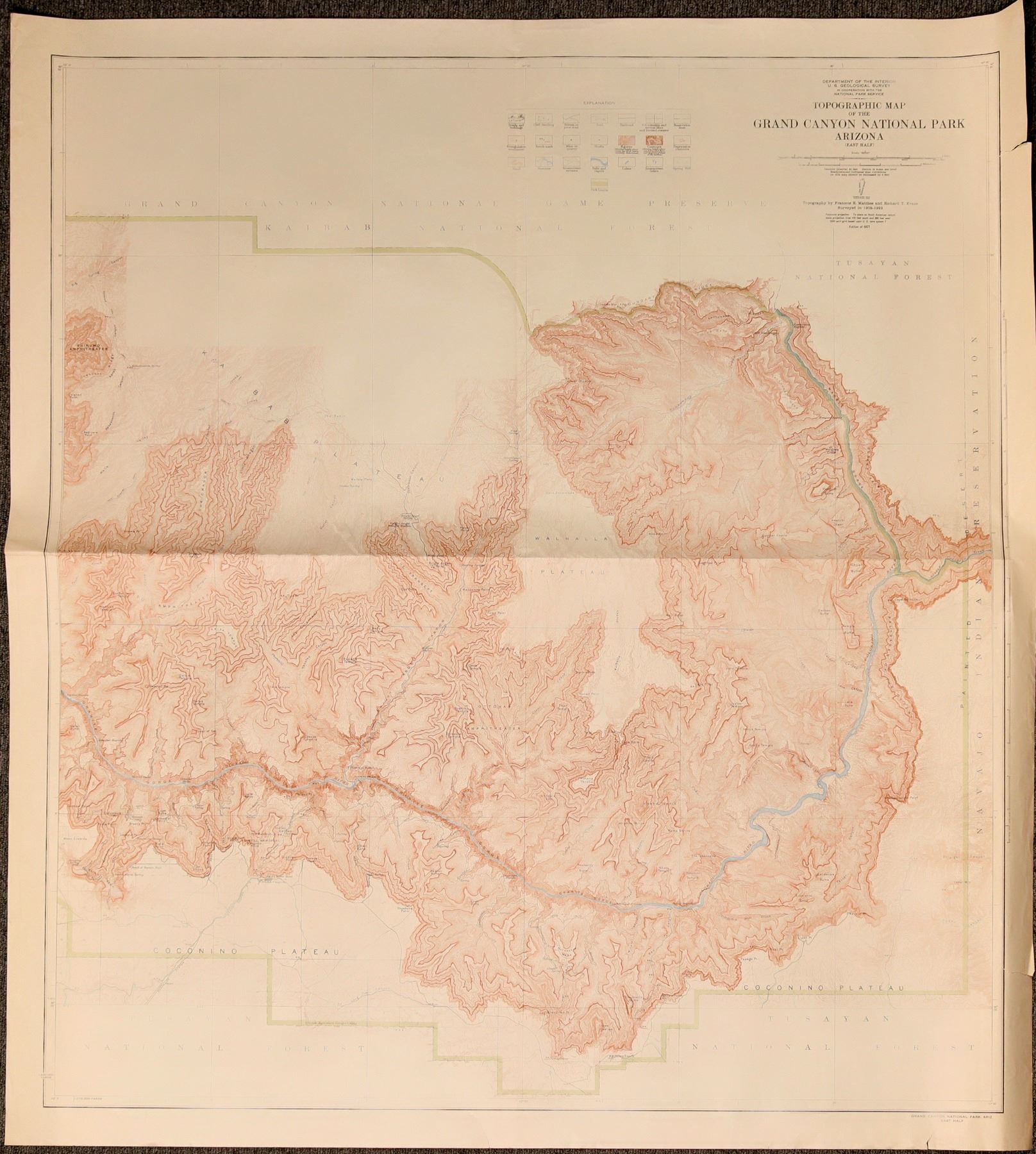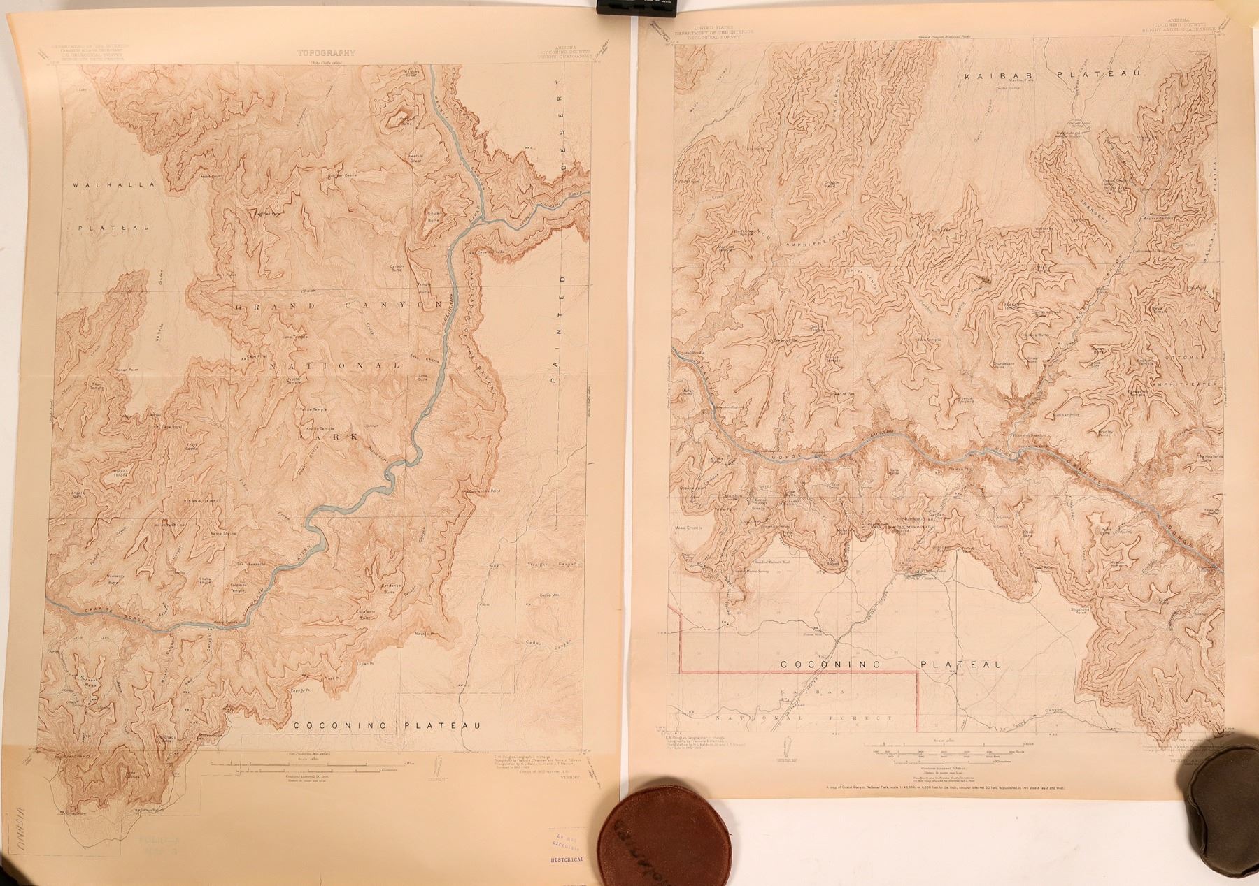 This is a cache of four Grand Canyon maps second editions: Bright Angel , 4800 scale, Douglas, 1906, 1947(note suspension bridge at Phantom Ranch); Vishnu, 4800 scale, Douglas, 1907, 1919 size 21 in. X 26in. Topographical map of Grand Canyon NP, 4800 scale, by Mathis and Evans 1909-1923, 1927 edition 23 in. X 41 in. East side; Topographical map of Grand Canyon NP, 4800 scale, by Mathis and Evans 1909-1923, 1927 edition 23 in. X 41 in. West side. Places of note: El Tuvar Hotel, Powell Memorial, Phantom Ranch, Havasu Falls, Supai, and Hilltop. Rail road access is the Santa Fe system.