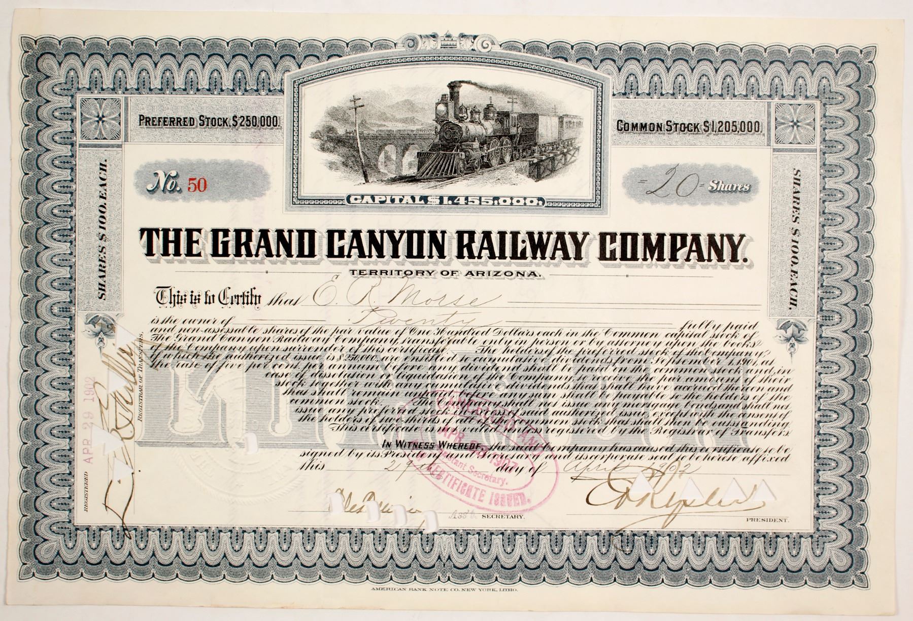 Extra rare! I/C #50 ER Morse 20 shares 1902 signed by President illegible. Punch cancelled. "In 1901, the Atchison, Topeka and Santa Fe Railway completed a branch line from Williams to Grand Canyon Village at the South Rim. The first scheduled train to carry paying passengers of the Grand Canyon Railway arrived from Williams on September 17 of that year. The 64-mile (103-kilometer) long trip cost $3.95, and naturalist John Muir later commended the railroad for its limited environmental impact. To accommodate travelers, the Santa Fe designed and built the El Tovar Hotel, located just 20 feet (6.1 meters) from the Canyon Rim. El Tovar opened its doors in January 1905." from wikipedia. Prag Collection. State: City: Date: 1902 HWAC# 83471