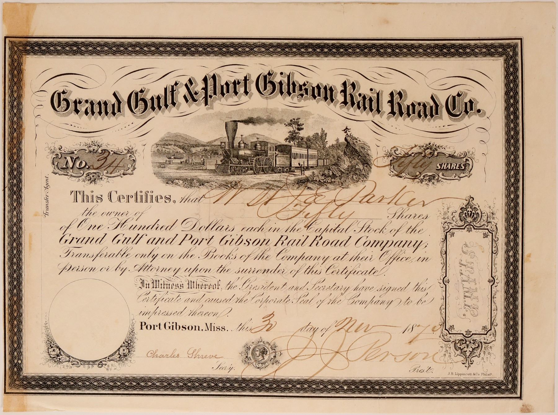 Started operations in 1852 and stopped service in 1883 for a total period of operations of 31 years operating in only Mississippi. #34, I/C, 50 shares issued Nov 30, 1870. signed J.J. Persou president. Black, no seal, vignette train rounding corner, cancel statement on reverse. EF Considered rare. Only #1 was believed to have been issued. J. B. Lippincott & Co printer.