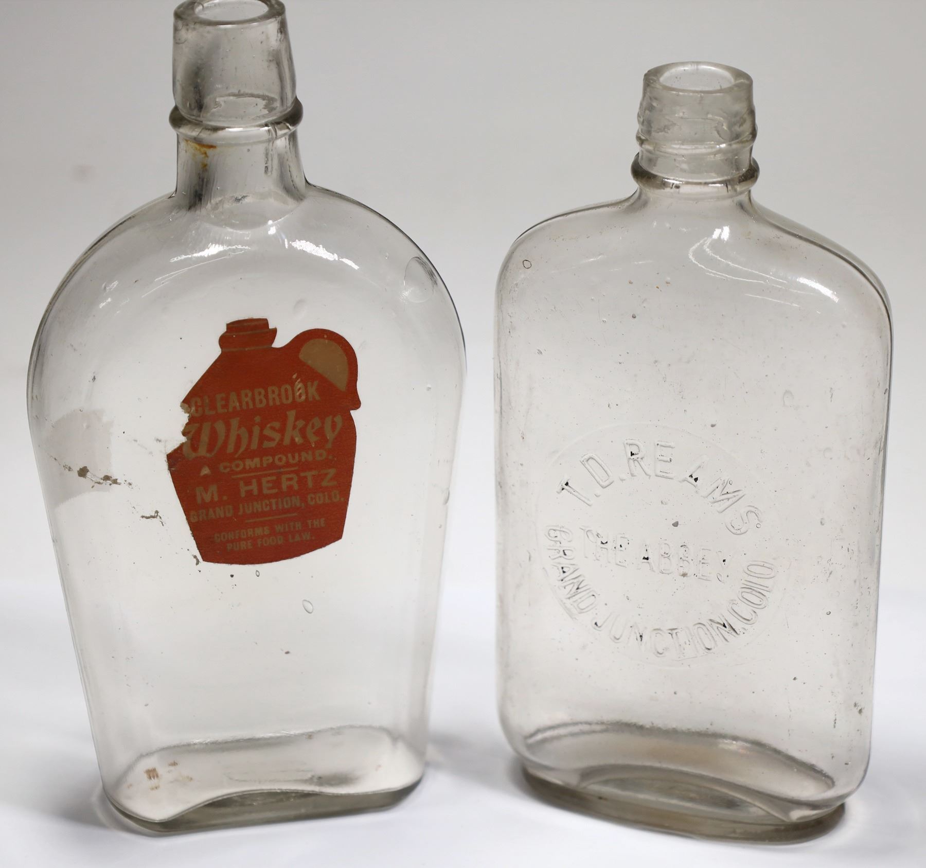 Lot of 2 different. 1) Preble W-87a. T.D. Reams / The Abbey / Grand Junction, Colo. Pint flask, clear glass, 7", smooth top. c.1902-04. Micro chips on rim, chip on front base, some haziness. 2) Paper label flask for Clearbrook Whiskey, M. Hertz, Grand Junction. Label is in the shape of a jug. Some loss to label. Bottle is shoo fly pint, clear glass, 7.5" Bubbles and surface abrasion. Please inspect.