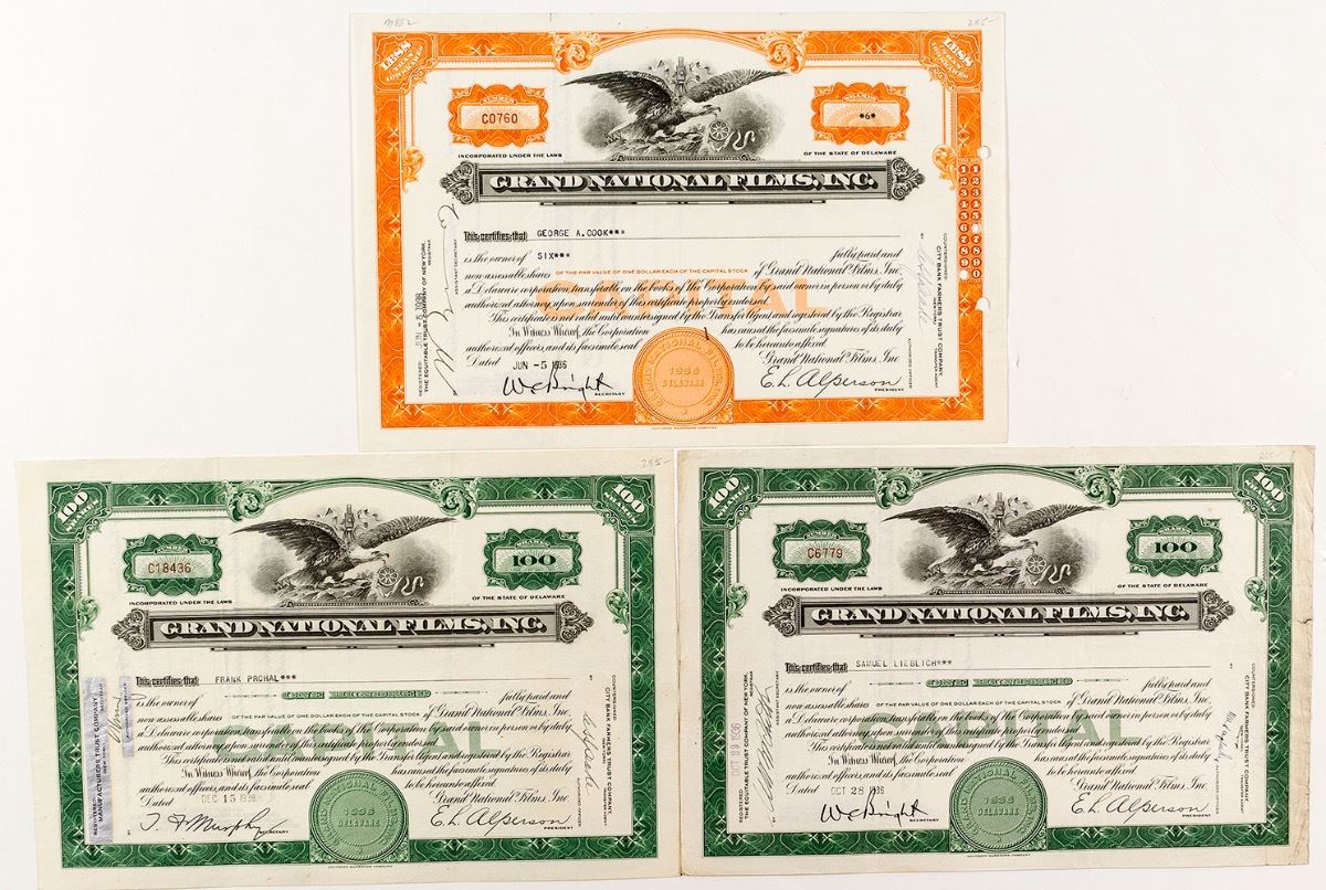 Trio of stocks for this company inc. in Delaware. Same vignette of eagle with camera on back and film reel near mouth. Two have green border (1936 and 1938, not cancelled) and one has an orange border (1936, punch cancelled). All signed by Edward E. Alperson as president. This American film company lasted 1936-1939. Folds and pinholes. (Prag Collection) City: State: Date: 1936-1938 ID# 31371