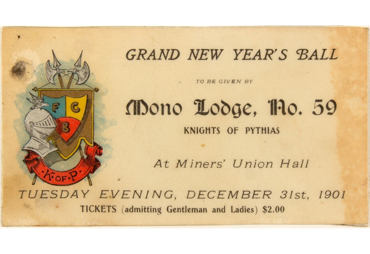 Given by the Mono Lodge No. 59 of the Knights of Pythias at the Miners' Union Hall Tuesday evening, December 31st, 1901. Tickets were $2. 4 /12 x 2 1/4". Laminated.