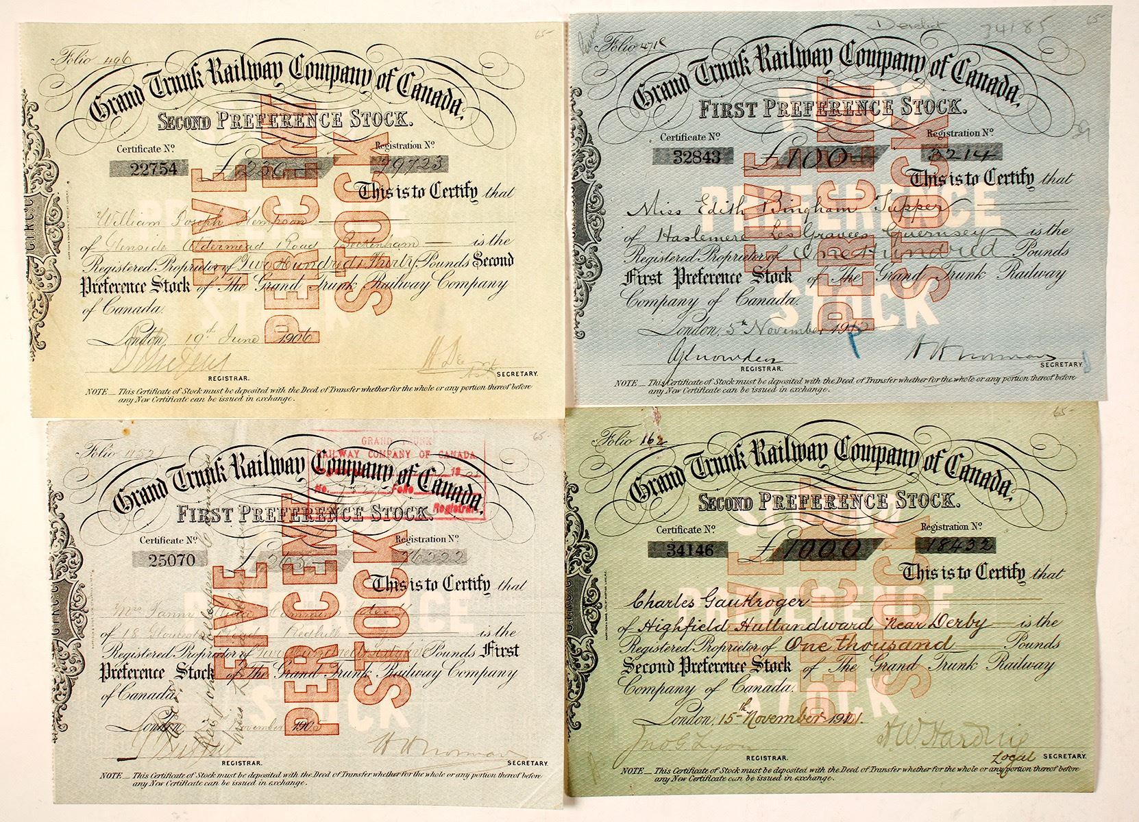 Lot of four different Grand Trunk Railway Company of Canada stock certificates. Date: Location: zCanada HWAC# 63931