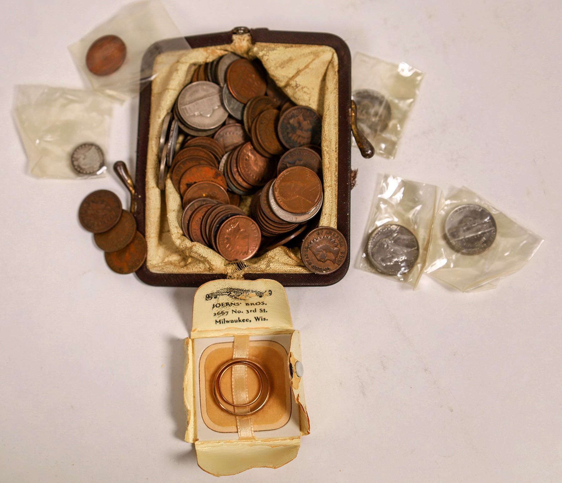 Vintage brown coin purse with 68 Indian head cents (we didn't look at all the dates, most in the 1900s); 1854 half dime (w/arrows); 1898 Barber dime; about ten wheat back pennies; some old Jefferson nickels and two wedding bands taken off May 26, 1974 (too tight).