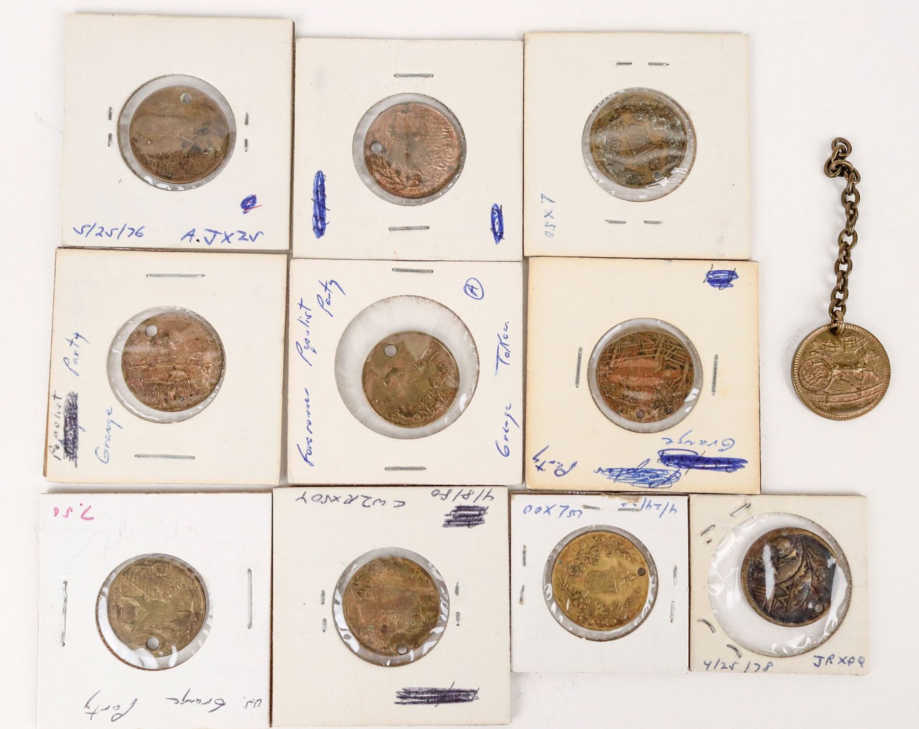 Lot of ten medals with attributes to the Granger movement, or the Grange Party, in the period after the Civil War. The medals are all holed, to be worn, are brass, round and 21 mm. Designs are similar: horse and cart, or horse in corral, Masonic like symbols or agricultural equipment on the other side. Oliver Hudson Kelley founded the Granger movement just after the Civil War. He began The Patrons of Husbandry to bring farmers together for educational discussions and social purposes. The movement grew to fight monopolistic grain transport practices, and is still active today.[