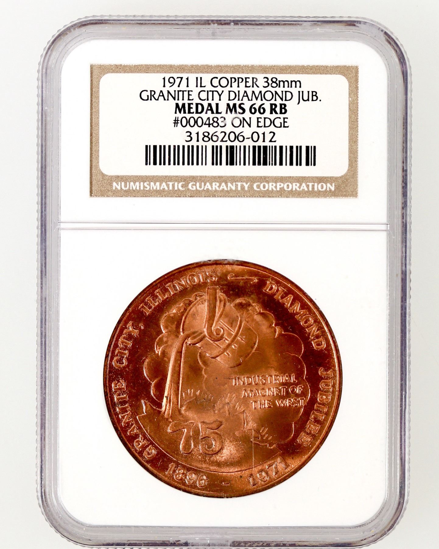 NGC graded MS 66 RB. 1971 copper, 38 mm Granite City Diamond Jubilee; #483 on edge.