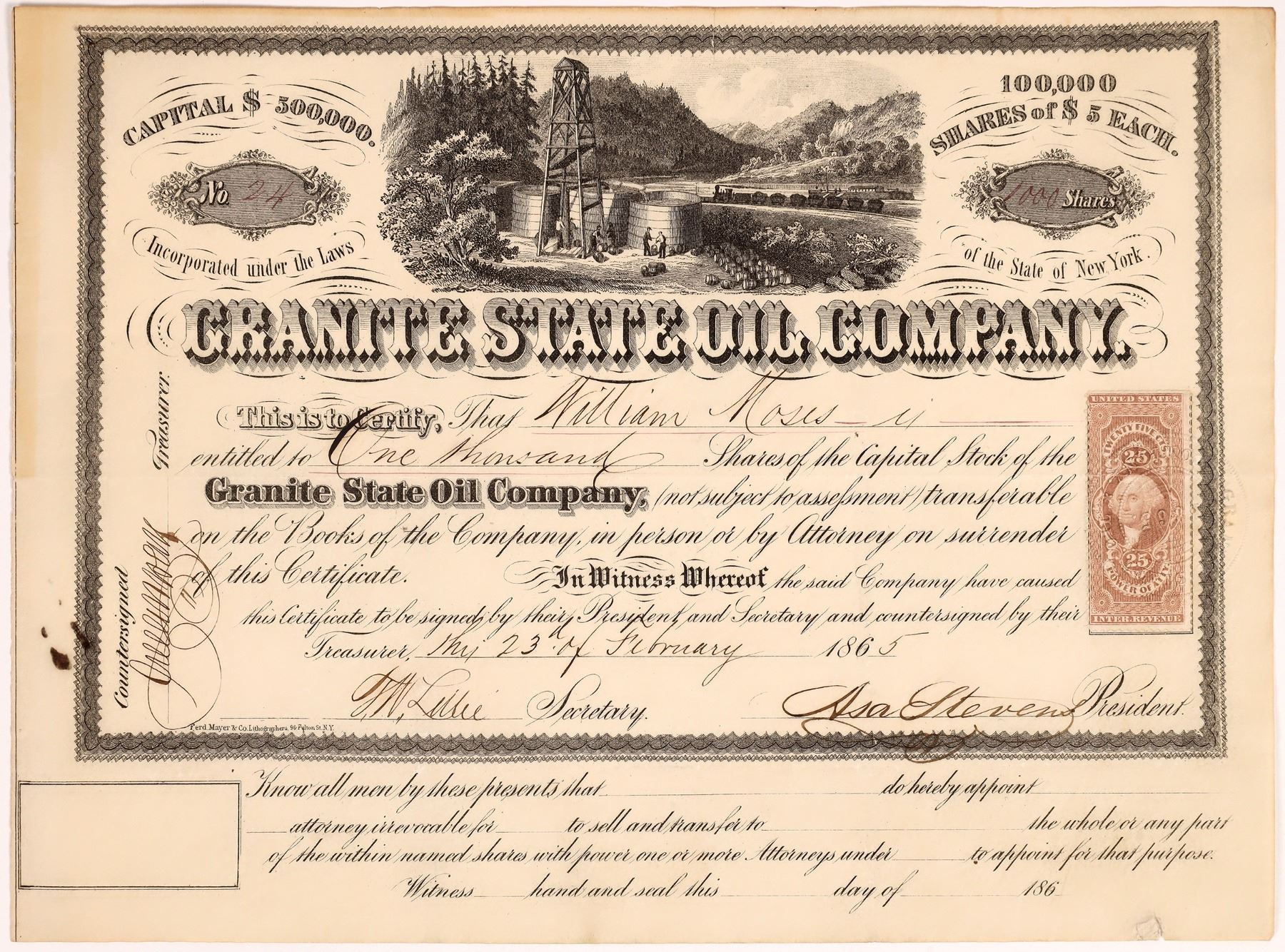 Inc. in New York. No. 24, issued for 1,000 shares to William Moses in 1865. Signed by president Asa Stevens, the treasurer and the secretary. Not cancelled. Very attractive design with bold company title and vignette with oil derrick and barrels. Printed by Ferd. Mayer & Co., NY. 25 cent US IR Power of Attorney stamp attached on the right. 7.75 x 10.25" Folds, ink stains. One would think the company name is an homage to New Hampshire. We did not find any articles on newspapers.com to help with the location, but did see a mention about Charles Willard going to Titusville, PA to work as a mechanical engineer for the company.