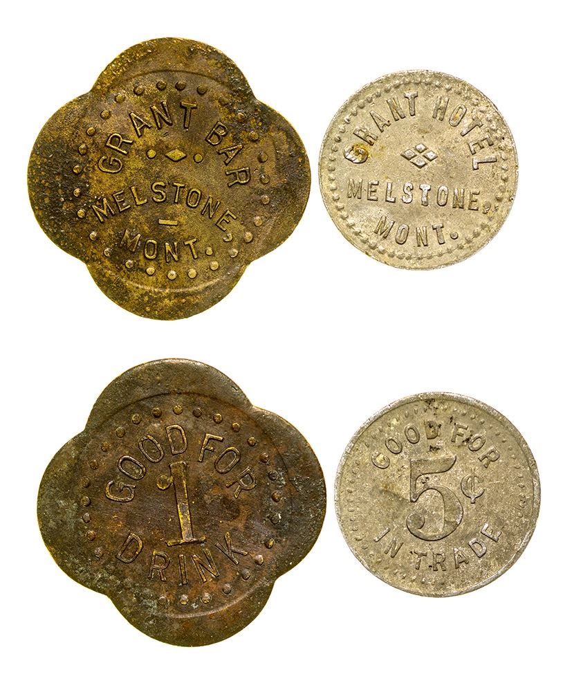 Lot of 2: 1) Obv.: Grant Hotel / Melstone, . Mont.; Rev.: Good For / 5c / In Trade; rd.,al., R-7; 2) Grant Bar / Melstone, / Mont.; Rev.: Good For / 1 / Drink; Scal. Br., R-7. City: Melstone State: Montana Date: ID: 36674
