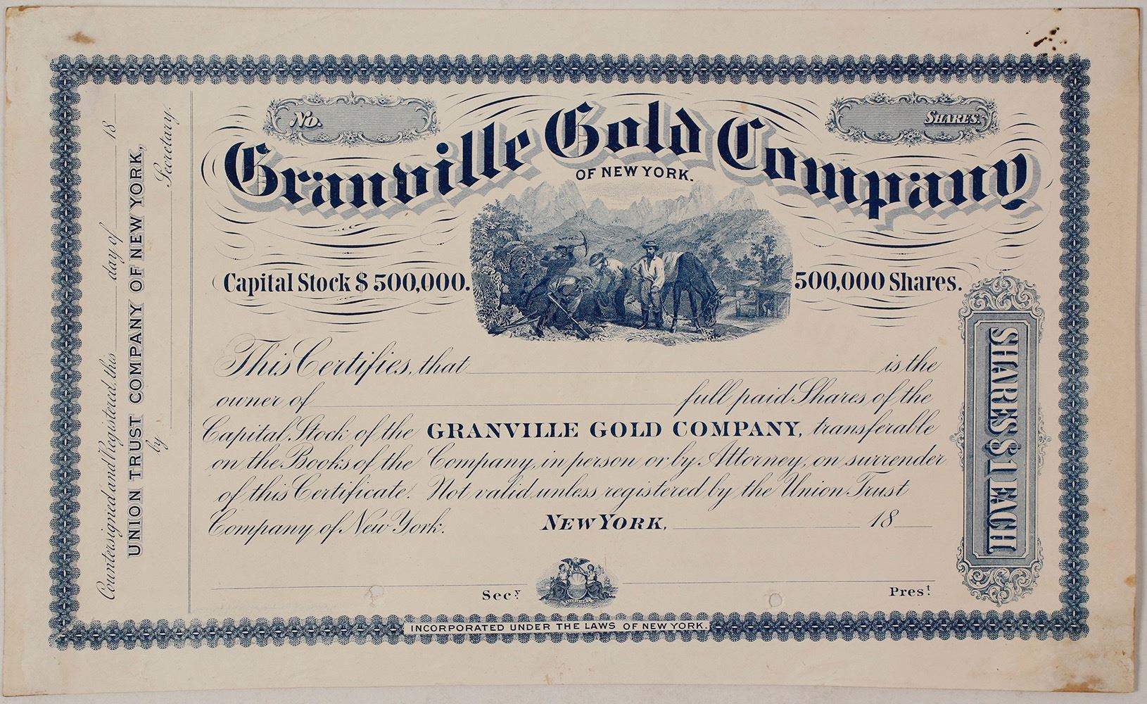 Nice looking blue on white specimen for the Granville Gold Company of New York. Incorporated in New York. This mine was located two miles southeast of Vein Mountain in McDowell County. [Burchard, 1882] Balch [1882] reported that the mine was a placer deposit in gravels that were mine hydraulically. The company had ditches 20 miles long and a sixty foot head of water. Fine condition. Two holes at secretary and president lines. Some staining on corners. (Be sure to see the stock certificate from the same company in this sale.) (Al Adams Gold Rush Memorabilia Collection) Date: c1879 Location: McDowell County, North Carolina HWAC# 57340