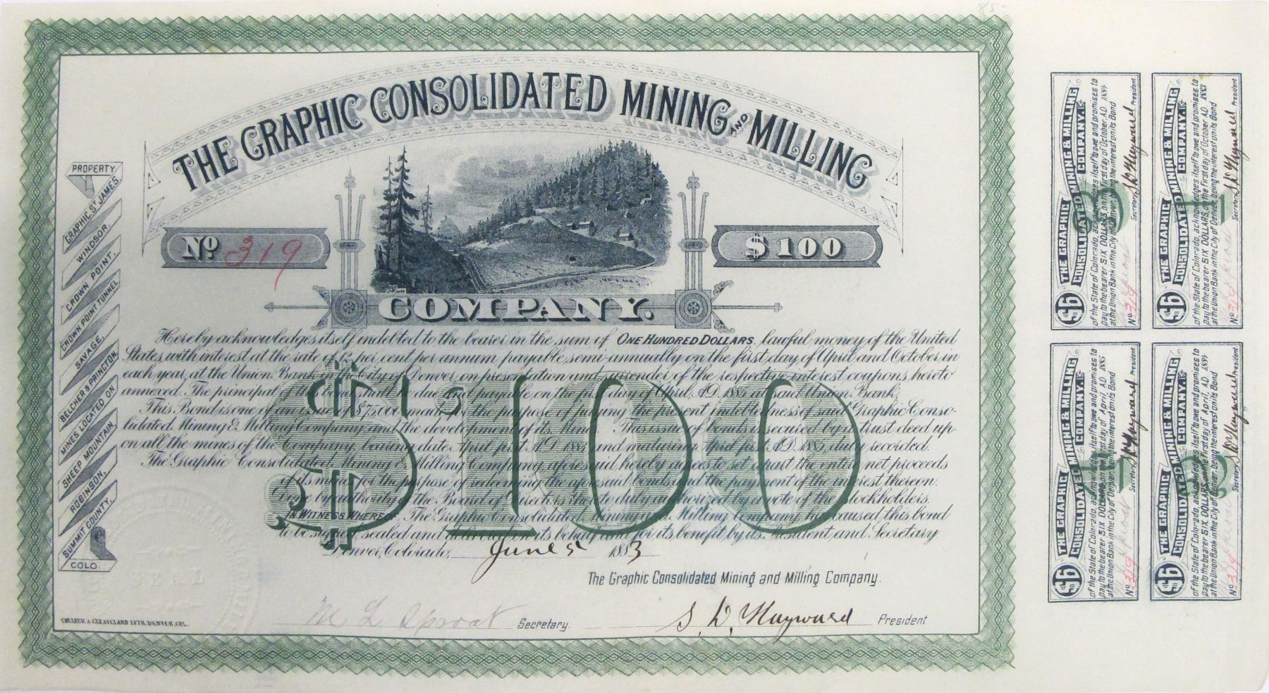 Mine names printed on the left side of the certificate: Graphic, St. James, Windsor, Crown Point, Crown Point Tunnel, Savage, Belcher & Princton. All located on Sheep Mountain, Robinson, Summit County, Colorado. No. 319, issued for $100 on June 5, 1883. Signed by president S.W. Hayward and the secretary. Not cancelled. Green border. Vignette of mining claims on a mountain. Four coupons attached. Printed by Collier & Cleaveland Lith, Denver. 6.5 x 12.25" Bent corner, folds. () State: Colorado City: Summit County Date: