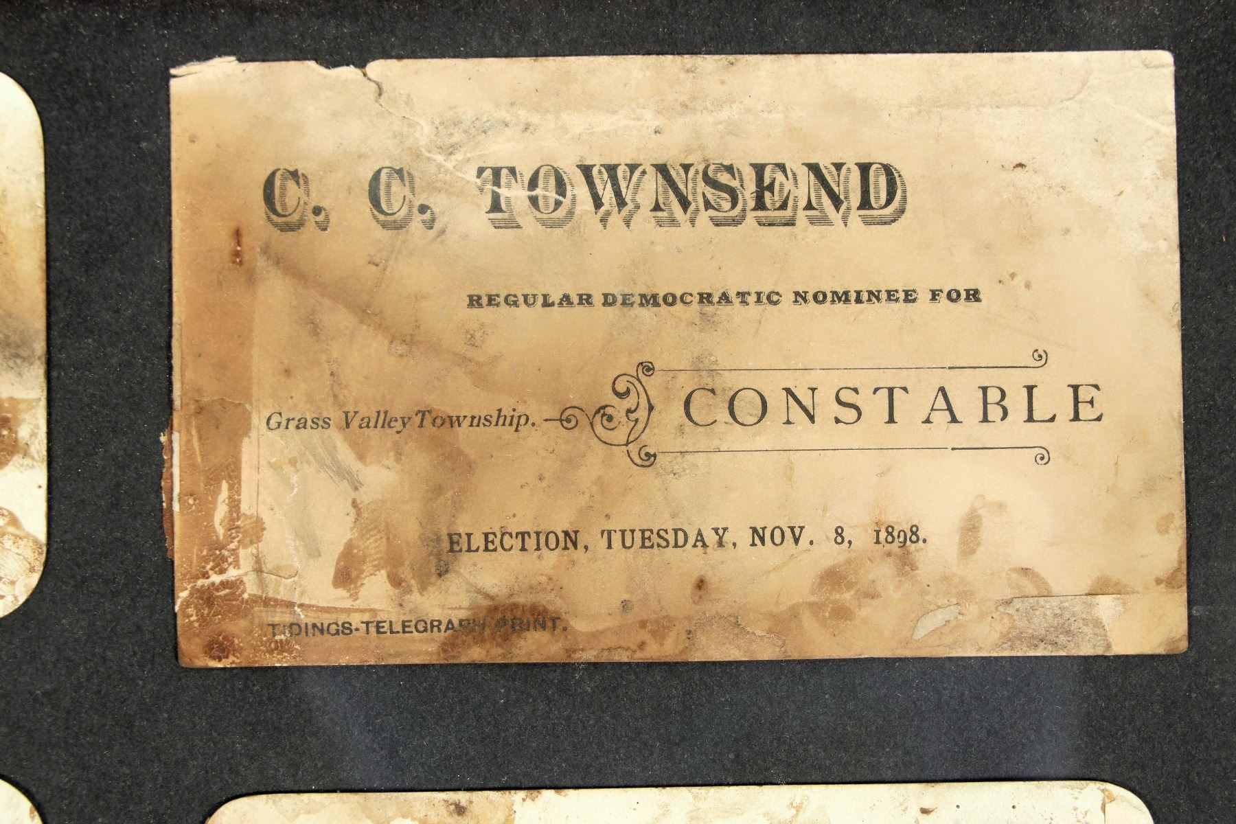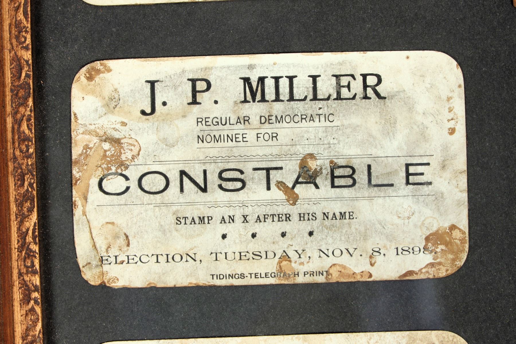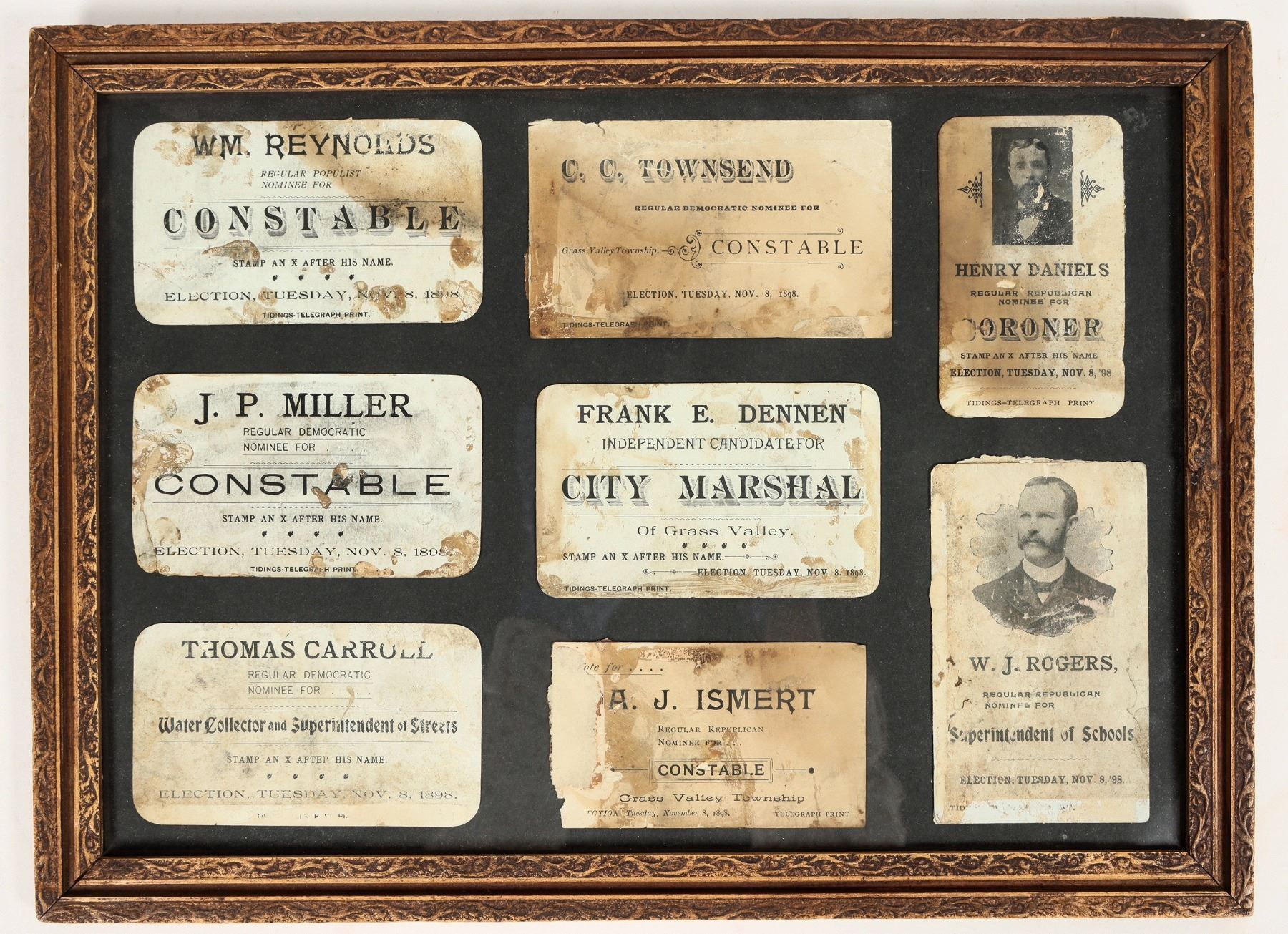 Framed display of 8 different candidates running for political office in the Nov. 8, 1898 election. Candidates include Wm. Reynolds for Constable, CC Townsend for Constable, JP Miller for Constable, Frank E. Donner for City Marshall, Thomas Carroll for Water Collector & Supt. of Streets, AJ Ismert for Constable, Henry Daniels for Coroner, and WJ Rogers for Supt. of Schools. Two are pictorial. All are heavily soiled. 11.25 x 15.25" frame.