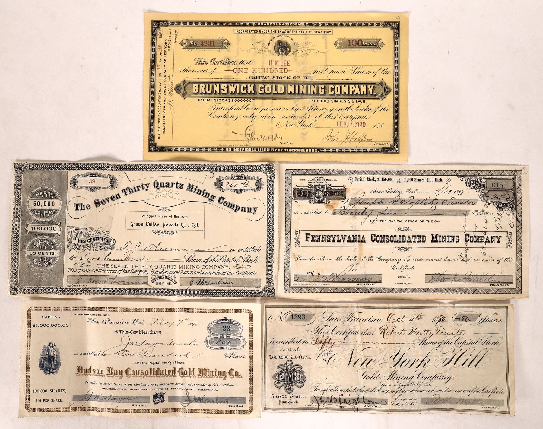Grass Valley stock certificates (5). Included is Brunswick Gold Mining Company#4231 for 100 shares at $5 per issued to H.K. Lee and signed by Secretary White and President Halpin. It's dated 1890. Next, Pennsylvania Consolidated Mining Company #615 for 25 shares at $100 per and issued to Joseph Toplitz and signed by secretary Thomas and president (illegible). It's dated 1898. Next, New York Hill Gold Mining Company #1393 for 50 shares at $100 per issued to Robert Watt and signed by president Robert Watts and secretary Leighton. Next, Hudson Bay Consolidated Gold Mining Company #33 for 100 shares at $10 per and issued to J Sayer. It is signed by Sayer as secretary and president (illegible). It's dated 1892. Lastly, The Seven Thirty Quartz Mining Company for for 200 shares at 50 cents per and issued to F.J. Thomas and signed by McClachlin and secretary Thomas. Please see photos for more details. Grass Valley California