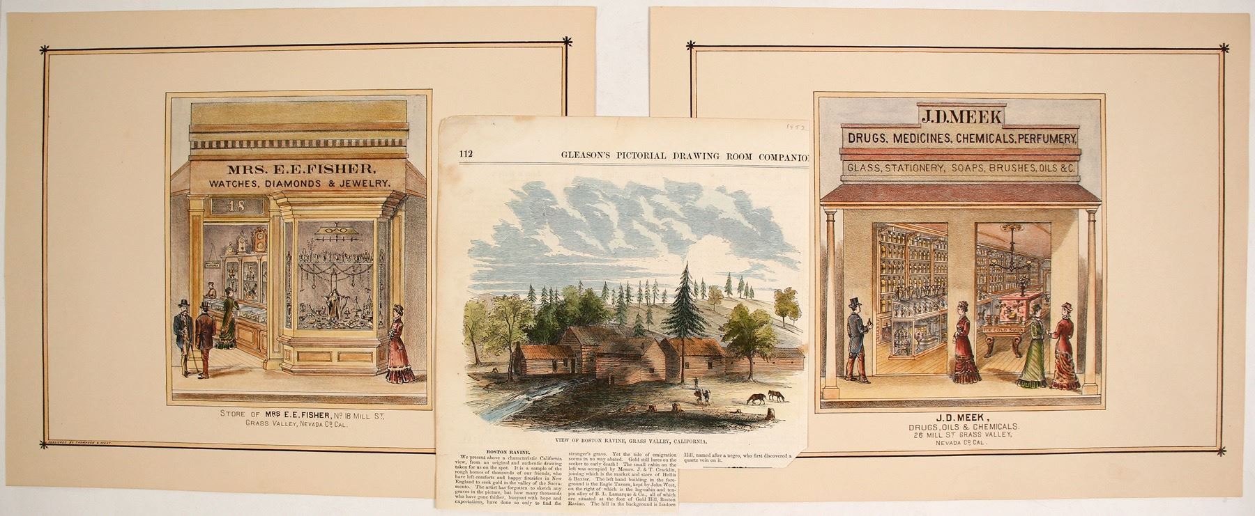 Lot of three 1) Watches, Diamonds, and Jewelry. The ladies seem very interested in this store. Them men not so much. Paper is 10.5 x 13". Lithograph is 6.75 x 5.75". Fine condition. Please see photo online. 2) J. D. Meek Grass Valley hand-colored lithograph. Lithograph is 6.75 x 6.25". 3) Finally there is one hand-colored piece from "Gleason's Pictorial Drawing Room Companion." View of Boston Ravine, Grass Valley, California. 5.5 x 7". Provenance, James Mackie Collection.
