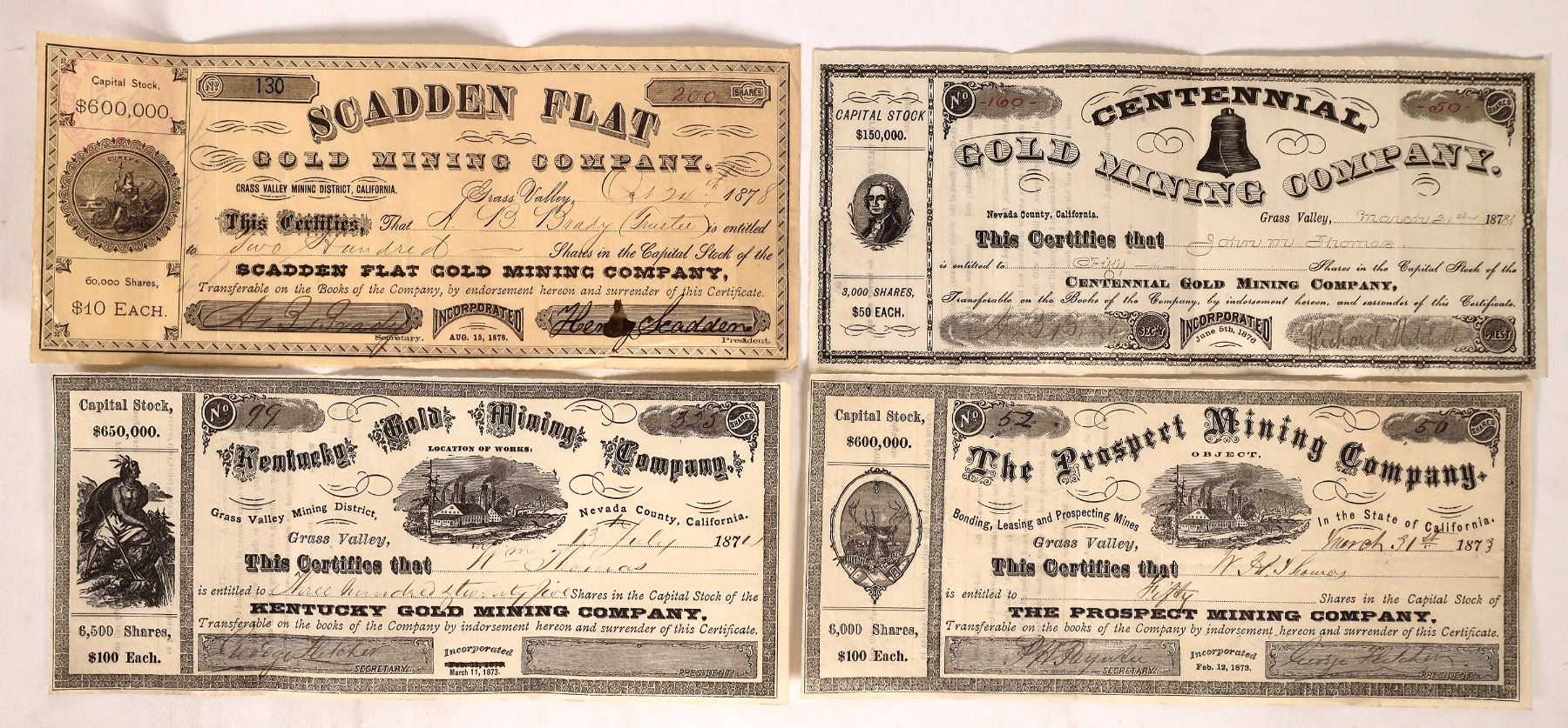 Grass Valley Mining stock certs (4) from the 1870s. included is Centennial Gold Mining Company #160 for 50 shares at $50 per and issued to John Thomas. It's dated 1881. Next, The Prospect Mining Company #52 for 50 shares at $100 per. It's issued to W. H. Thomas and is dated 1873. Next, The Kentucky Gold & Mining Company #99 for 325 shares at $100 per and issued to W. Thomas and is from 1874. Lastly, is from Scadden Flat Gold Mining Company #130 for 200 shares at $10 per and issued to A. B. Brady and is from 1878. All in nice condition. Please see photos for more details. Grass Valley California