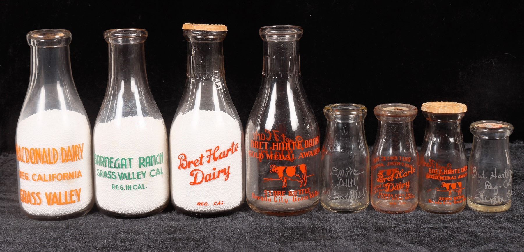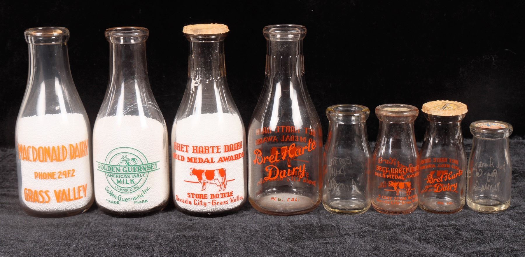 A group of 8 milk bottles from Grass Valley, Nevada. 6 are silk screen, 2 are etched.