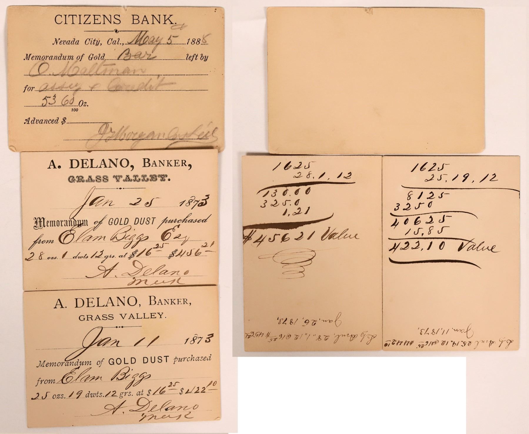 Three gold rush momentos: two gold dust cards by A. Delano, Banker, Grass Valley in 1873, both from Elam Biggs; also an 1885 purchase of a gold bar by the Citizens Bank of Nevada City. Ex: Ron Lerch Collection.