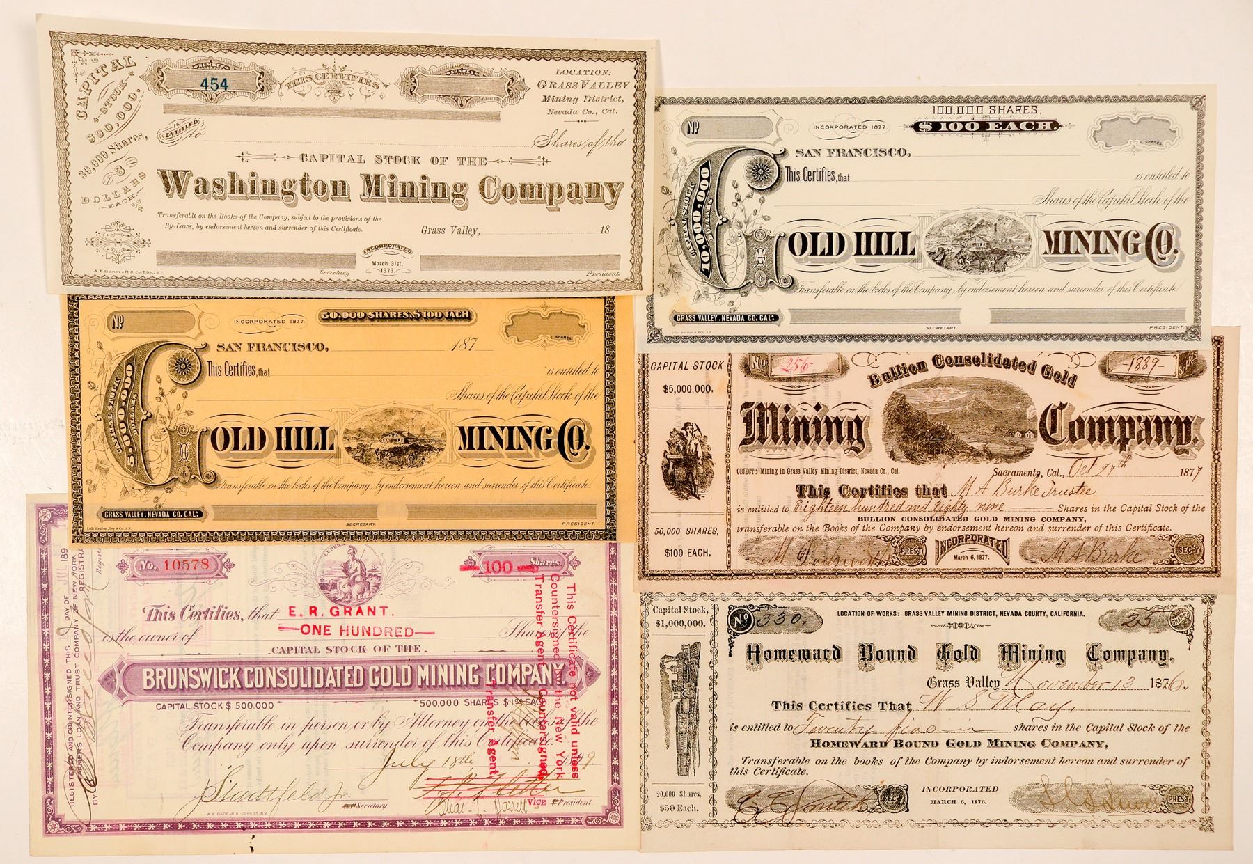 Lot of 6. Three are issued, three unissued. Nice group! 1) Bullion Consolidated Gold Mining Company. Issued in 1877. Grass Valley Mining District. Issued to the president. Not cancelled. Two mining vignettes. Very nice! 2) Homeward Bound Gold Mining Company. Grass Valley Mining District. Issued in 1876. Not cancelled. Locomotive vignette. Folds, very good. 3) Brunswick Cons. Gold Mining Co. Issued in 1899, not cancelled. Very good. 4-6) Three unissued stocks: two different for the Gold Hill Mining Company and one for the Washington Mining Company. Please inspect. Ken Prag Collection