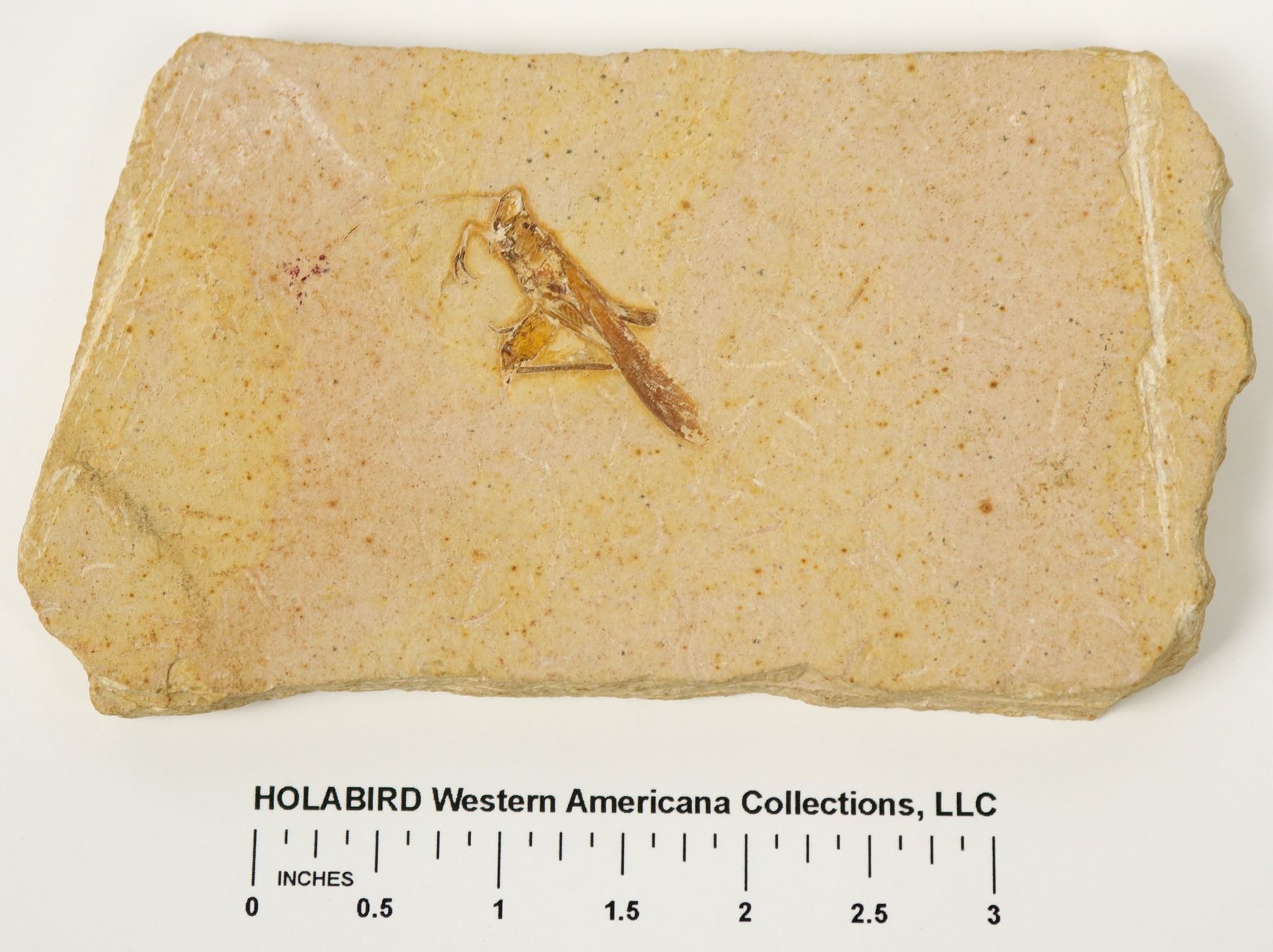 Rare grasshopper encased in a 3 x 5 inch piece of shale. The fossil is 1 1/2 inches long and 1/2 inch tall, dark brown on the tan color stone.
