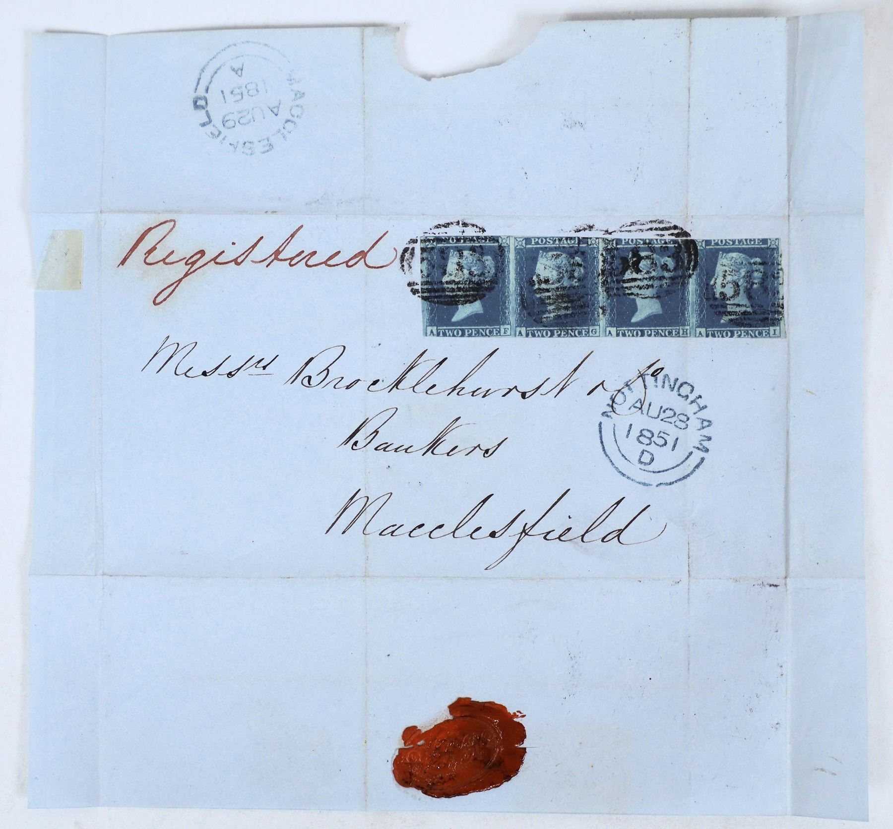 Great Britain. 1851 registered lettersheet to bankers Brocklehurst & Co. in Macclesfield franked with 1841 2p strip of four (Scott #4, cutting at top and bottom) tied by "583"cancels of Nottingham, light file folds, very attractive.