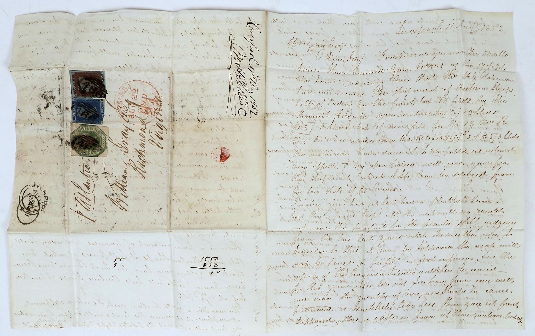 Great Britain. 1852 lettersheet to Richmond Virginia franked with 1841 1p & 2p plus 1847 1s (Scott #3, 4, 5, see scan for margins) tied by "466"cancels of Liverpool, "AT. PACKET PAID 24"red datestamp, ms. "pr [ship] Atlantic," attractive three-color franking.