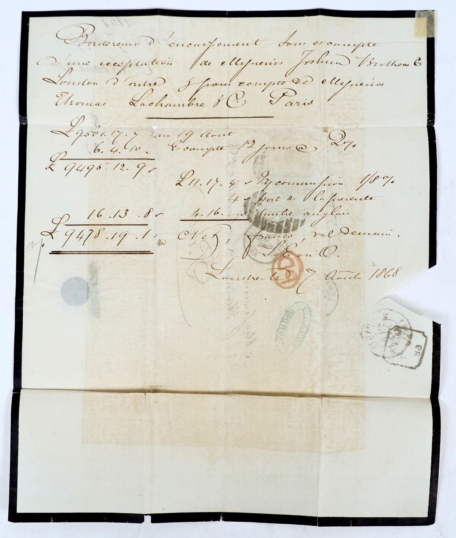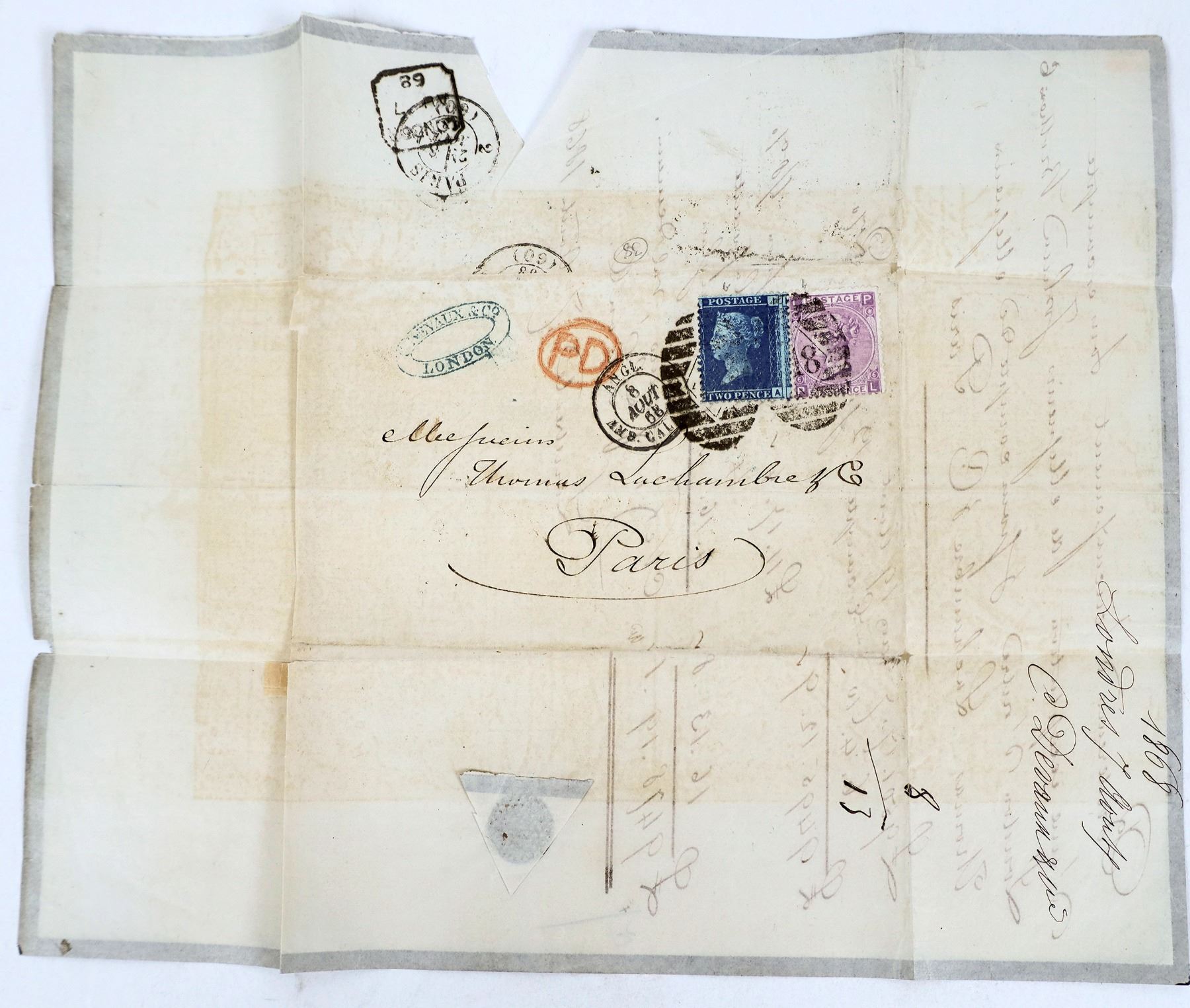 Great Britain. 1868 black-edged commercial lettersheet to Paris franked with 1867 6p & 1858 2p (Scott #29, 50) tied by "18" targets, scarce destination and franking.