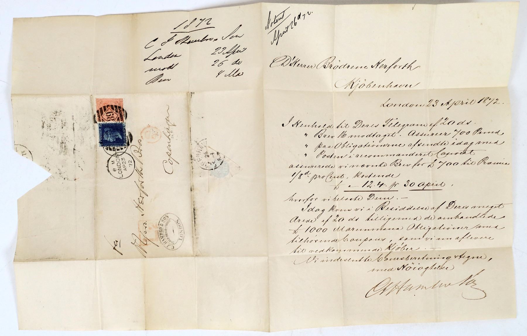 Great Britain. 1872 lettersheet to Copenhagen Denmark franked with 1865 4p & 1869 1p (Scott #30, 43) tied by sharp "89" duplexes, red "L2" late fee handstamp, very clean and attractive.