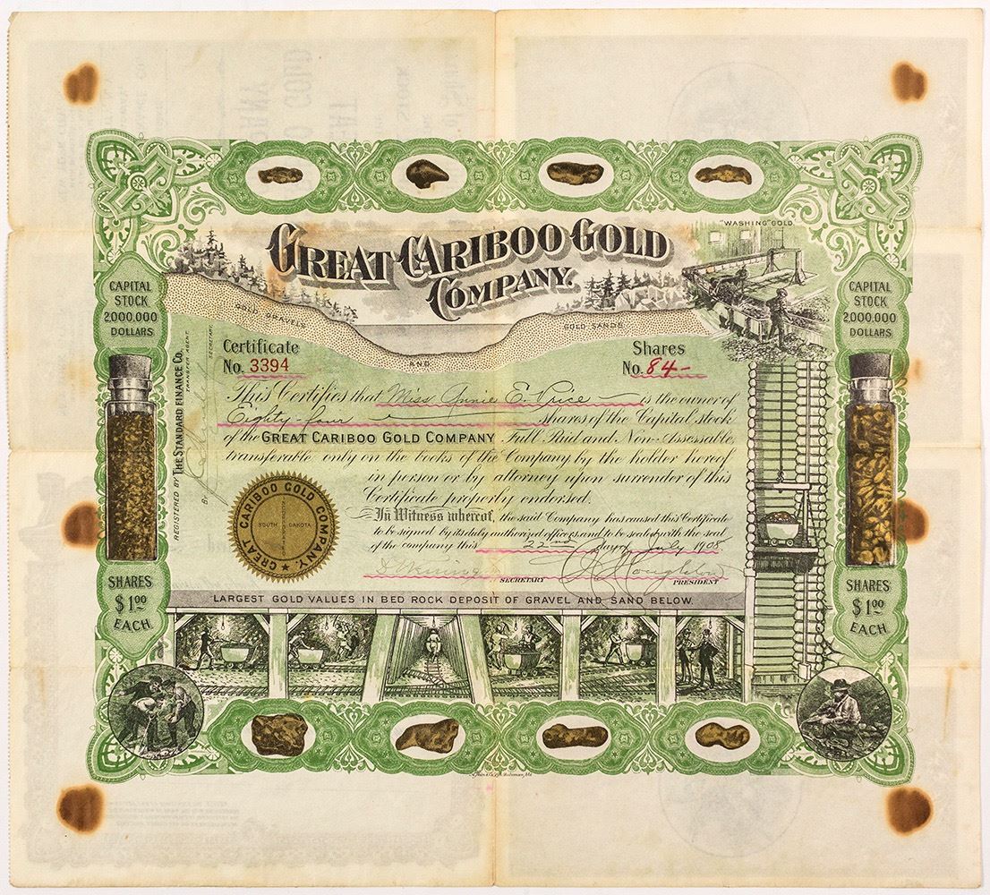 This is one of the most impressive stock certificates you will ever see. Eight gold nugget vignettes. Three miners with a gold nugget. Vial with gold inside. Etc.! Number 3394 to Miss Annie E Price for 84 shares. 1908. Measures 15" x 13 3/4". Signed by J. Houghton as President. Incorporated in South Dakota. Soiling throughout, some soiling along crease margins, small tears at folds. Annie E. Price (1833-1910) is possibly Benjamin Price's daughter from the UK. The company was in British Columbia, Canada. It was a successor to the British American Gold Mining & Trading Co which was organized five or six years ago for the purpose of working several claims in the Lightning Creek district of British Columbia. Results fell very far short of the predictions made by the promoters and the company came in for considerable criticism by reason of the fact that it had not been managed in a way which promised very well for stockholders. [Still] if given a careful and conservative management, a thing with which the old company was not blessed, the Great Cariboo Gold Co may make out all right in time. But in view of what has happened in the past we hardly look for such a result. [United States Investor, 1905] Date: 1908 Location: Lightning Creek District, zCanada HWAC# 55043