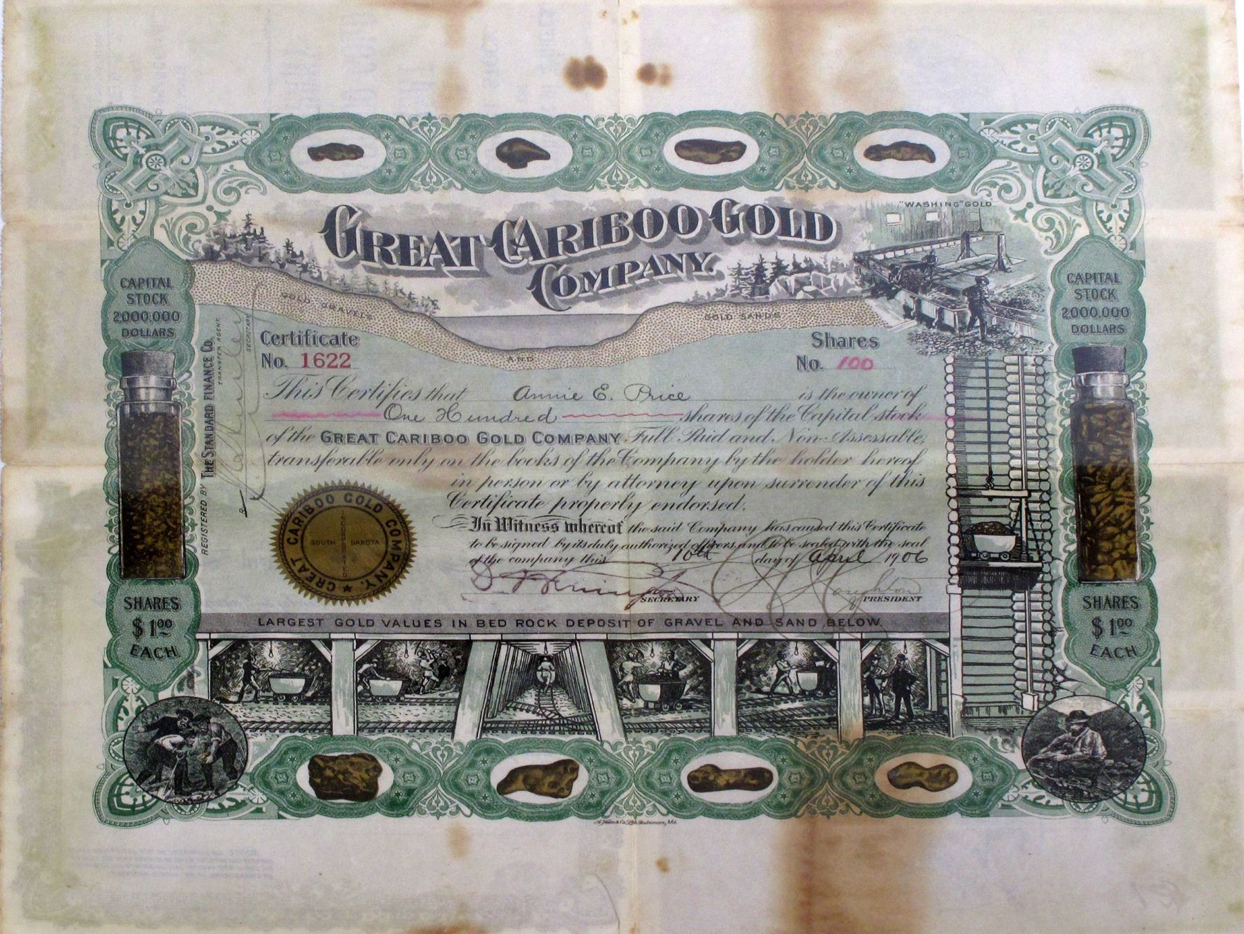 The famous Great Cariboo Gold Company illustrated color certificate. These are unarguably one of the great mining stock certificates. About 16" square, green black and gold. Illustrated with nuggets all around, 2 vials of gold left and right and mining scenes all around. Issued to Annie E. Price for 100 shares, April 10, 1906, signed by J. Houghton as VP. Incorporated in South Dakota. Foxing spots throughout, some soiling along crease margins. Annie E. Price (1833-1910) is possibly Benjamin Price's daughter from the UK. The company was in BC.