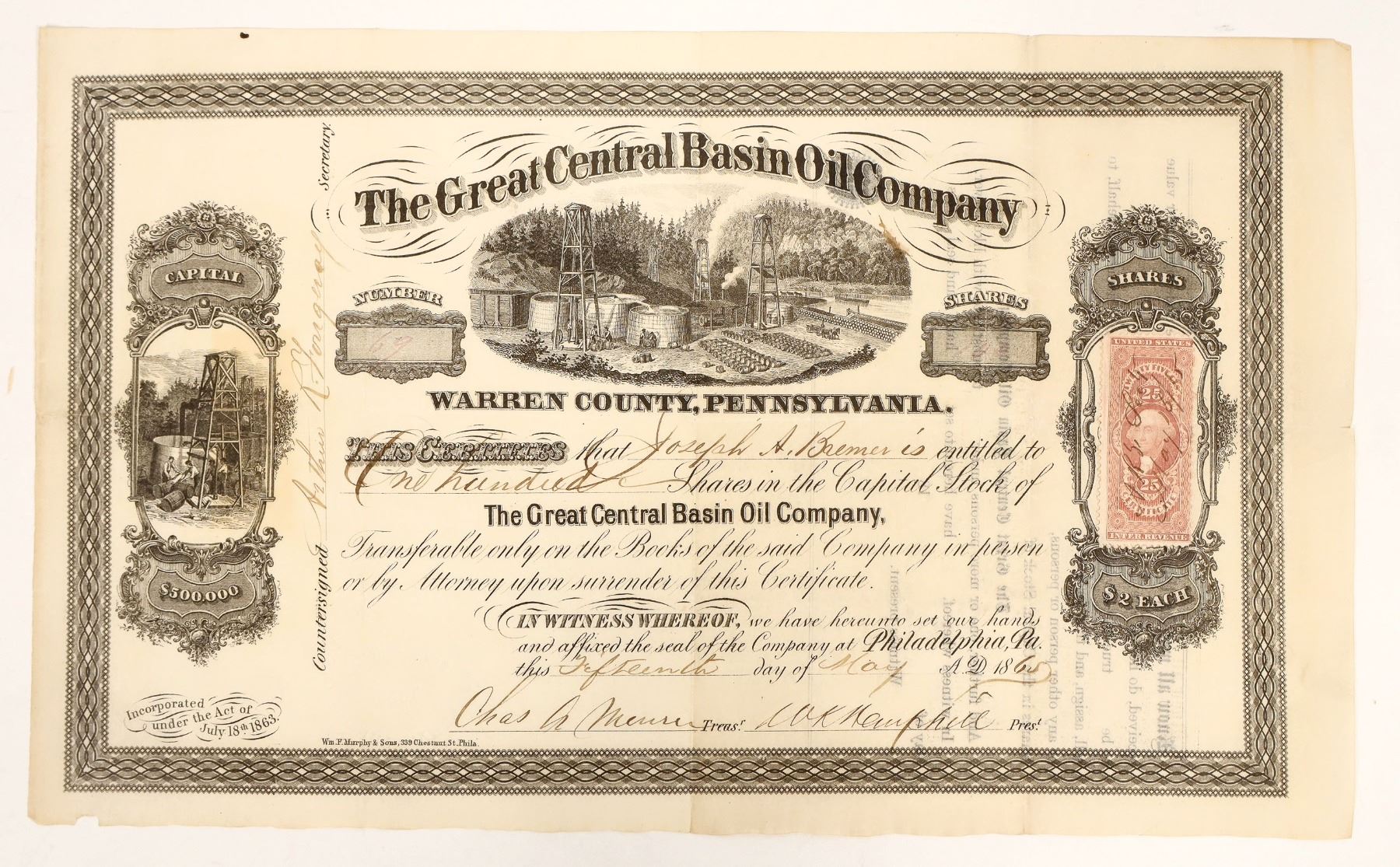 A stock certificate for 100 shares in the Great Central Basin Oil Company, made out to Joseph A. Bremer and dated 1865. The stock certificate has been signed by the treasurer of the company, C.H. Meurer, as well as its president, W.K Hemphill. Embossed company seal on lower right hand side. It features two beautiful, engraved vignettes of oil processing scenes. A 25¢ United States IR stamp is affixed to the certificate within a stamp frame. Some wear including minor tearing along edges and creasing from storage. Uncancelled.