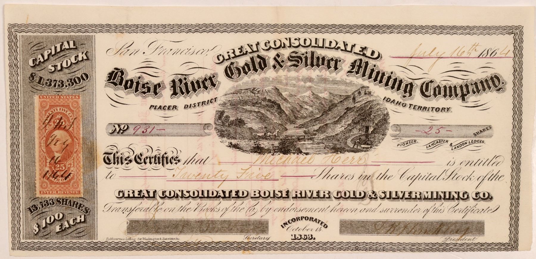 I/U #931 Michael Herr 25 shares 1864. Mine entrance vignette, signed by President illegible. Incorporated 1863, located in Placer District. We could not find any info on this mine. City: State: Idaho Territory Date: 1864