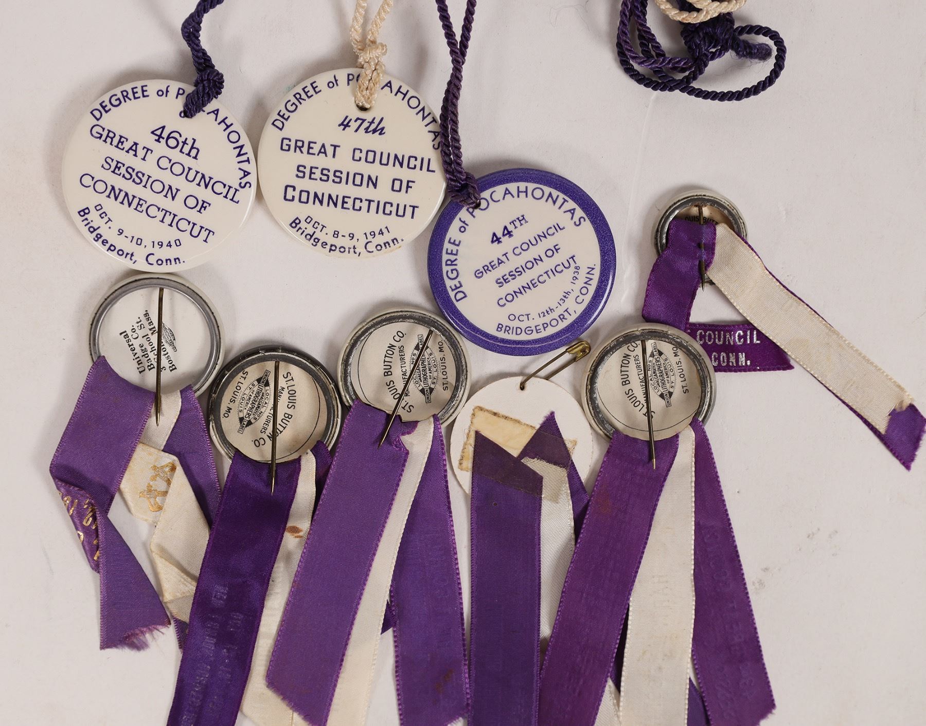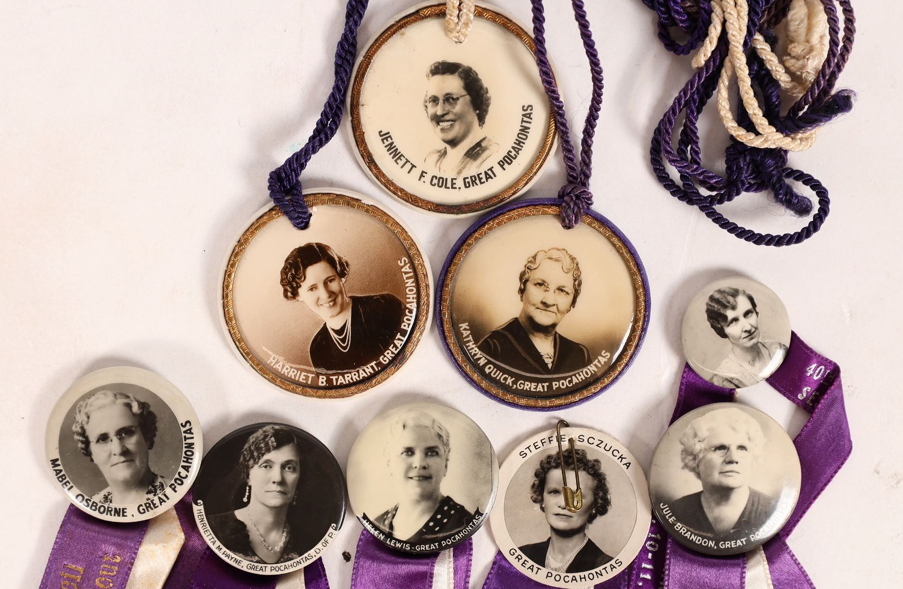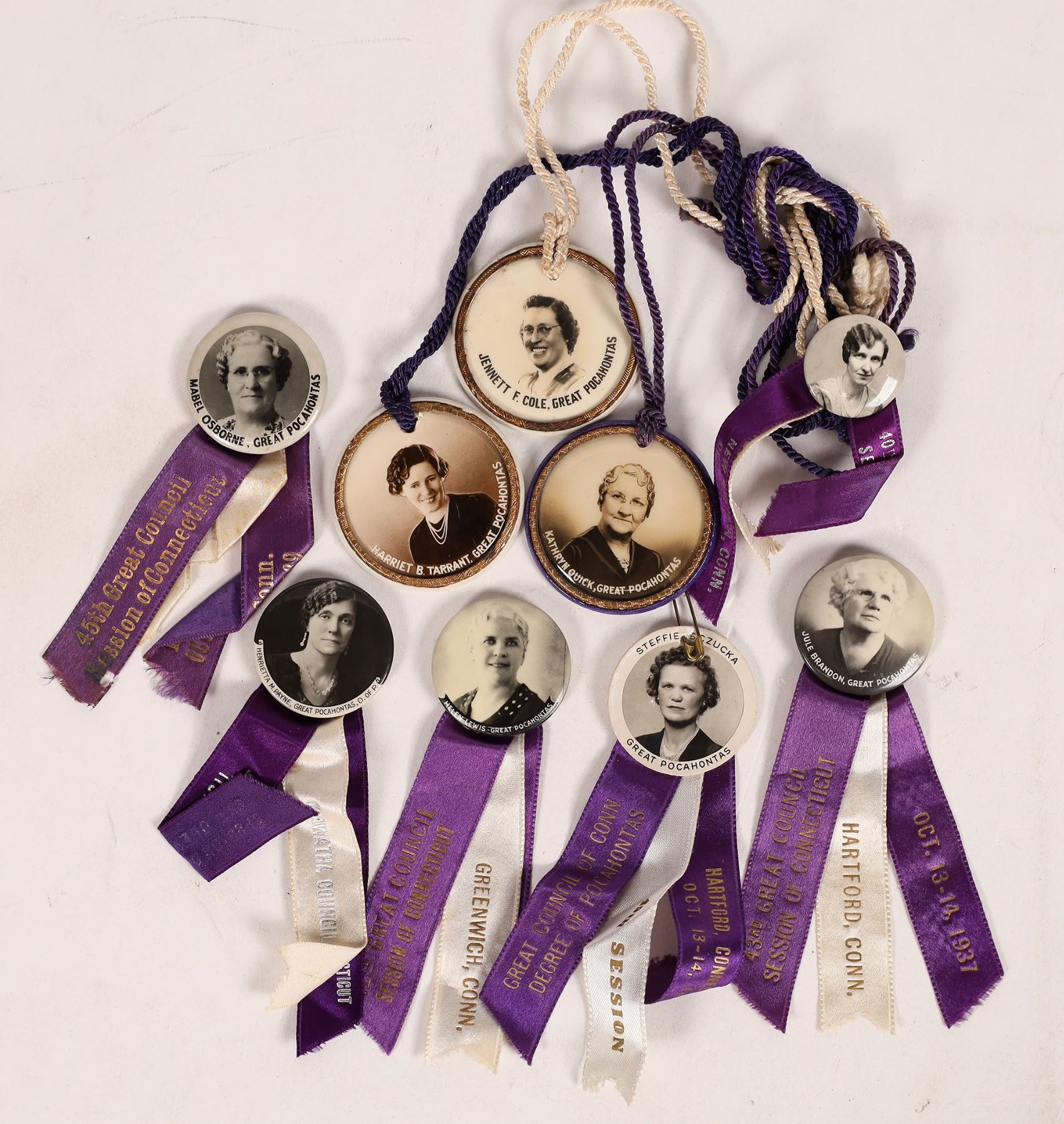 Collection of nine badges from Great Council Sessions of the Degree of Pocahontas. Photo buttons of the Great Pocahontas from 1932, 1934, 1936, 1937, 1938, 1939, 1940, 1941, 1943.