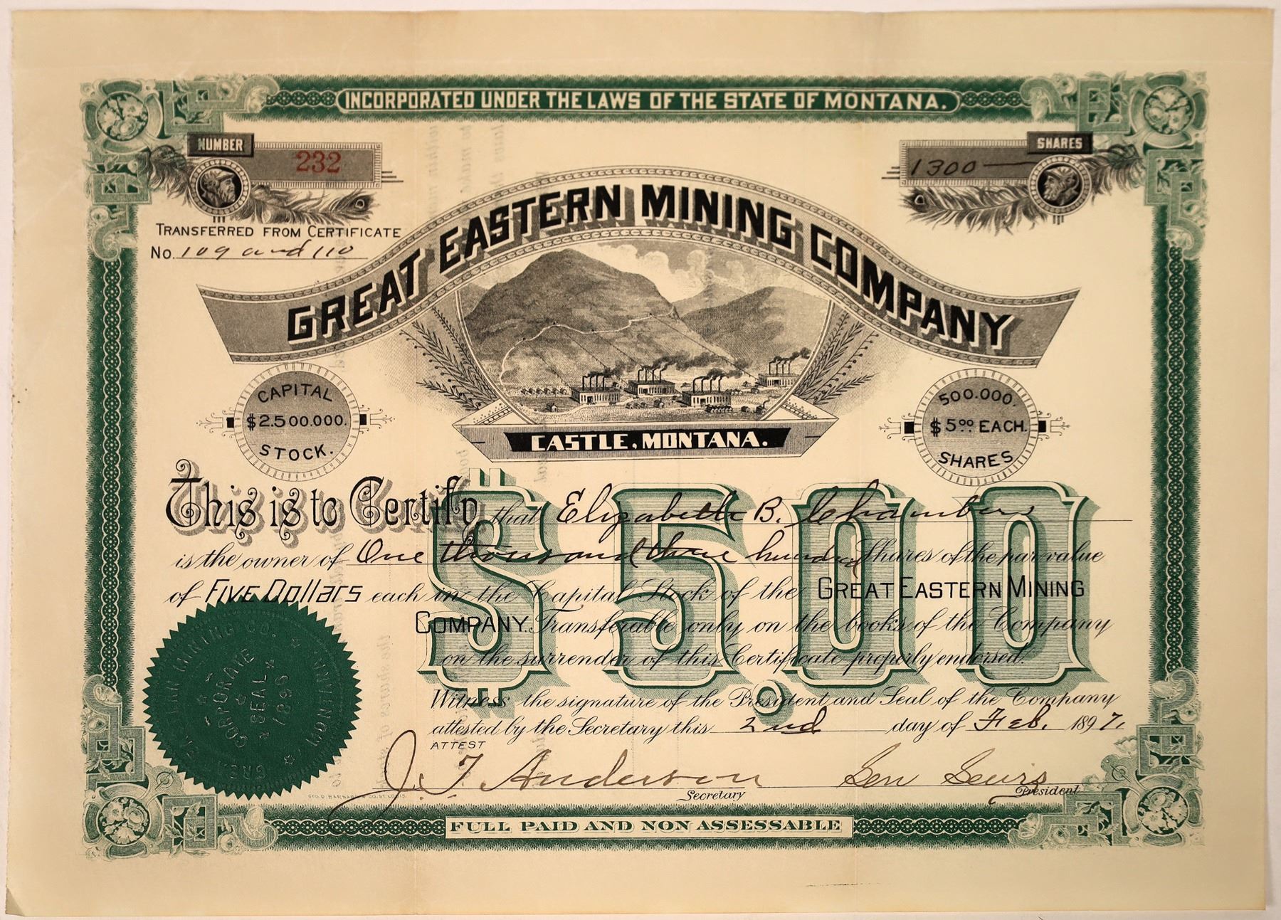 # 232 for 1,300 shares to Elizabeth Chambers. Signed by JT Anderson and president Ben Bevis(?). Dateline Feb. 2, 1897. Black with green underprint and border. Geo. Barnard of Chicago printer. Four mills below a mountain with road going up to mines. Incorporated in 1890. Nicks at fold edges, some wrinkling. Overall nice! Located in the New World district. It seems a new effort to work the mine came in 1898. A new Steam hoist was purchased that year for the mine.