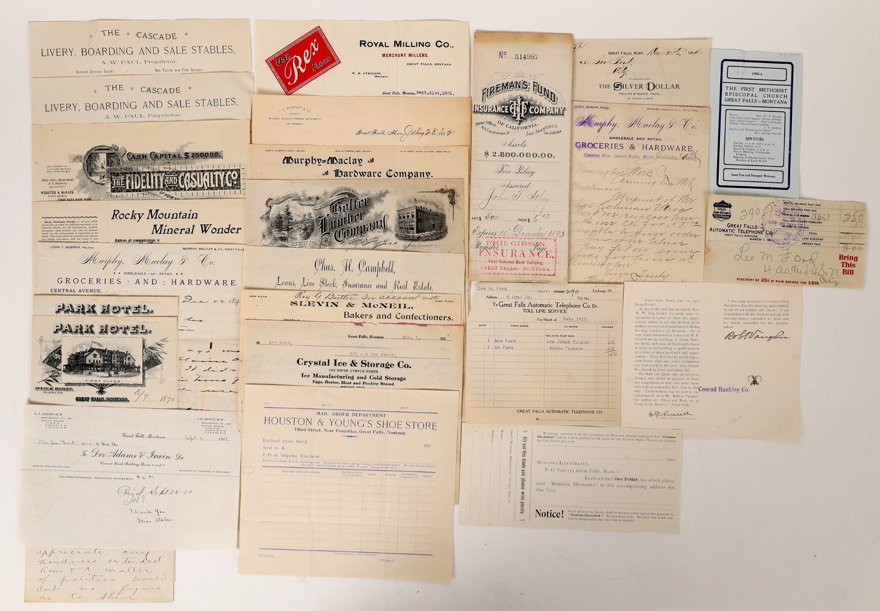 About 15 Great Falls mostly billheads and letterheads, c. 1890-1907. Some pictorial. 1892 Fireman's Fund insurance policy. Montana Great Falls