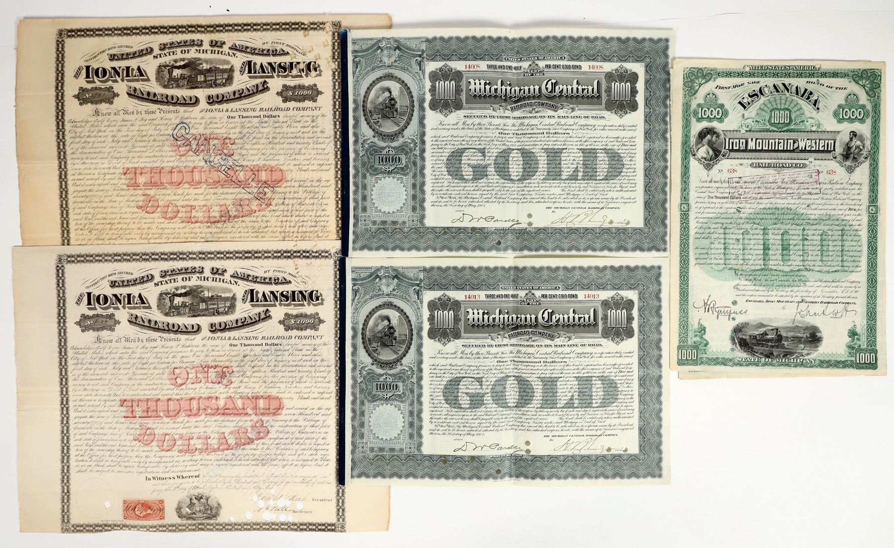 Lot of 5. 1. Tw, I/C. #14013 &14008. The Michigan Central Railroad Co., $1000, 3 1/2 % gold bearer bonds, issued 1902, due 1952. Both signed by H.B. Ledvord president. Vignette train @ depot left side. "GOLD" green underprint American BNC printer. EF cond. 2. I/C, #638. Iron Mountain and Western Rail Road Co. , $1000, 5% gold bearer bond. Issued 1890, due 1920. Vignettes: top left/right allegorical females and male, bottom , "1000" green underprint. , all coupons attached. American BNC printer. Near EF cond. 3. I/C, Two : #501 and 632. The Ionia and Lansing Railroad Co., $1000, 8% bearer bonds. Issued 1869, due 1889. $1 and 5c revenue stamps are attached to the bonds. Vignette 4-4-0 under steam, "ONE THOUSAND DOLLARS" red underprint. The Calvert Litho Co printer. VG cond.