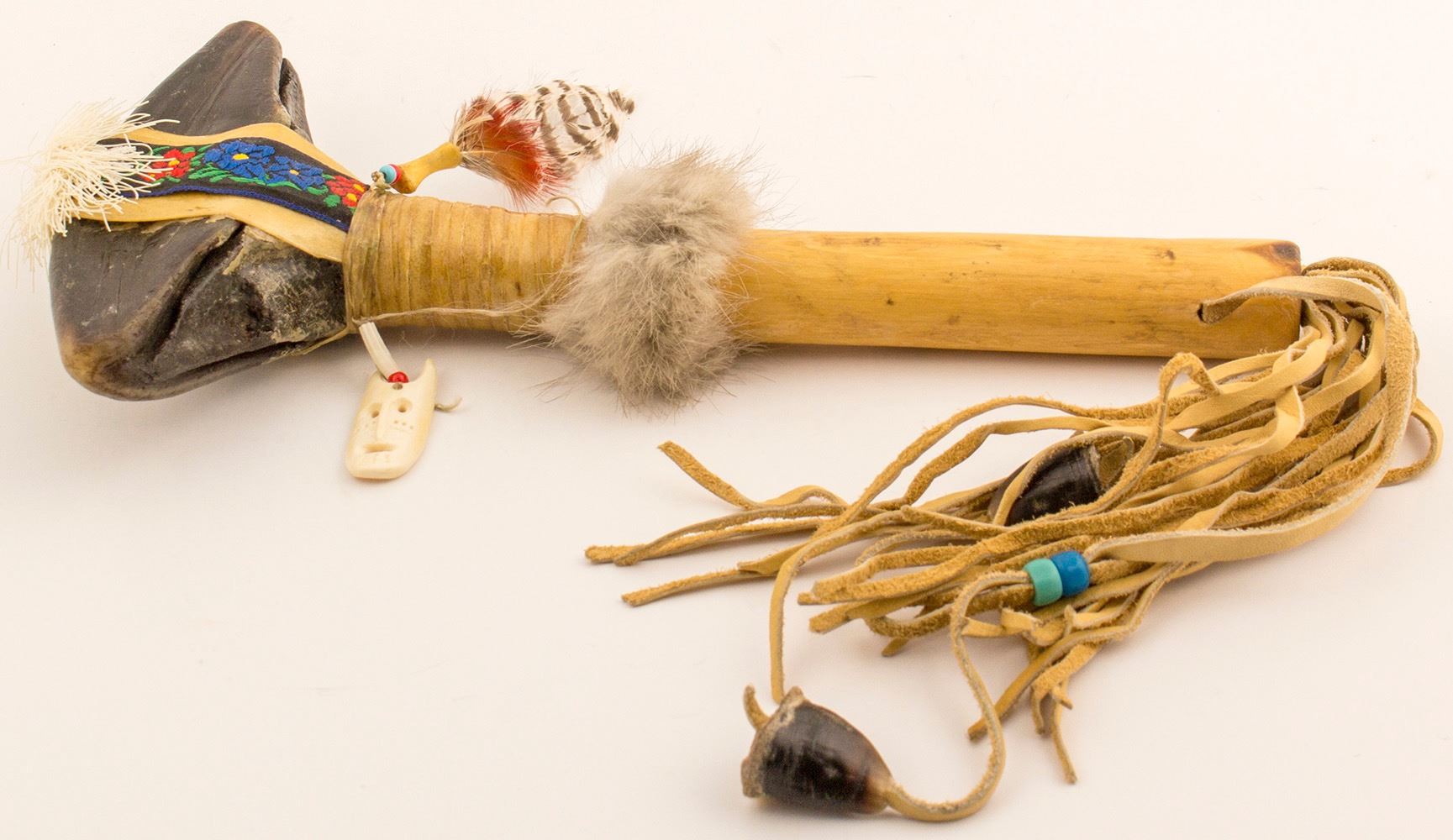 Has a colorful, floral design, cloth rap. Tomahawk shaped gourd on top. Feathers, mask hanging! Leather tassels off of the end of the handle with two small gourds. Eleven inches tall and six inches across at the rattle. Late 20th Century. Date: Location: HWAC # 55807
