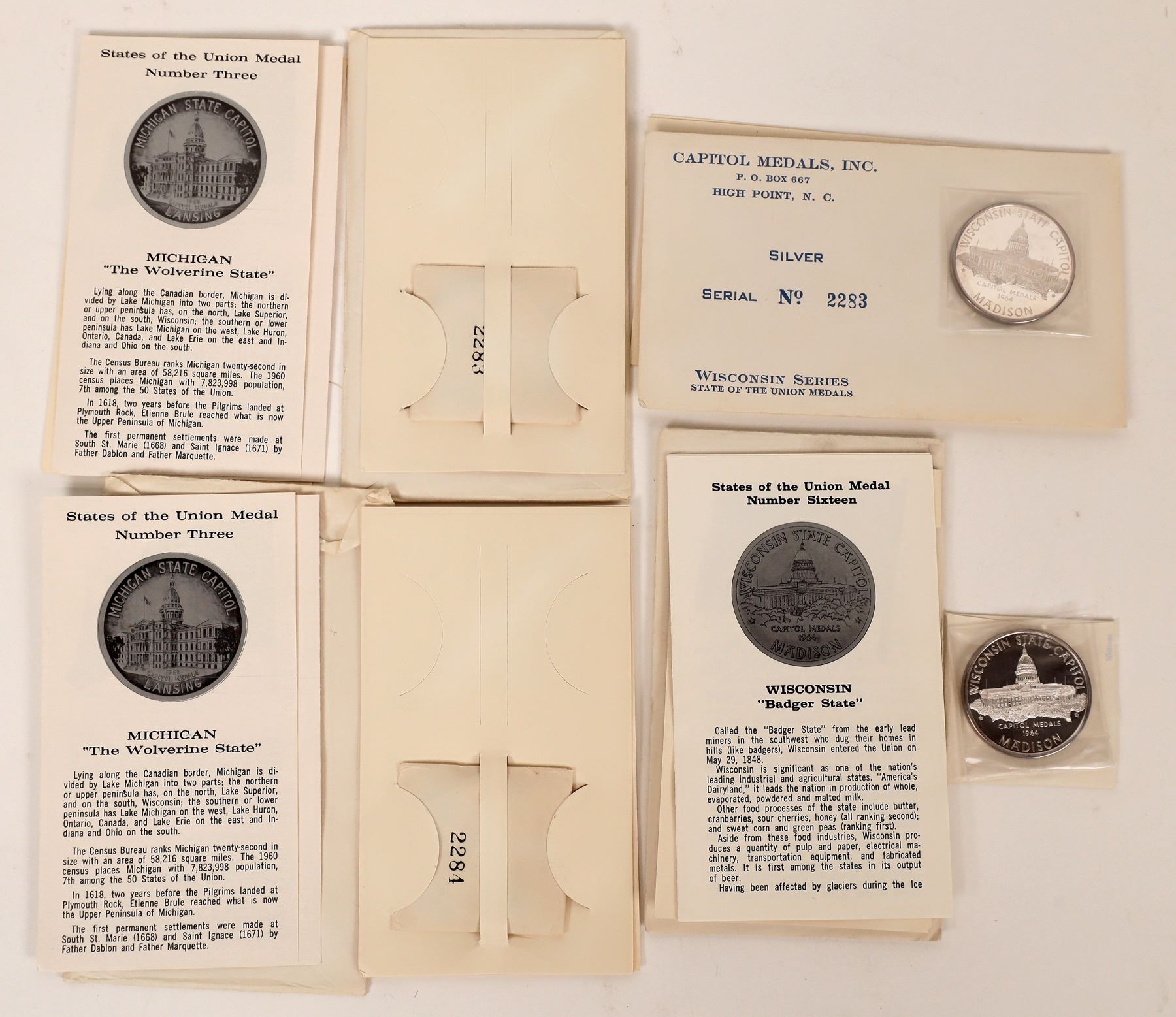 4 States of the Union medals by Capitol Medals, High Point, NC. 1.5", silver. 2 each-MI and WI.