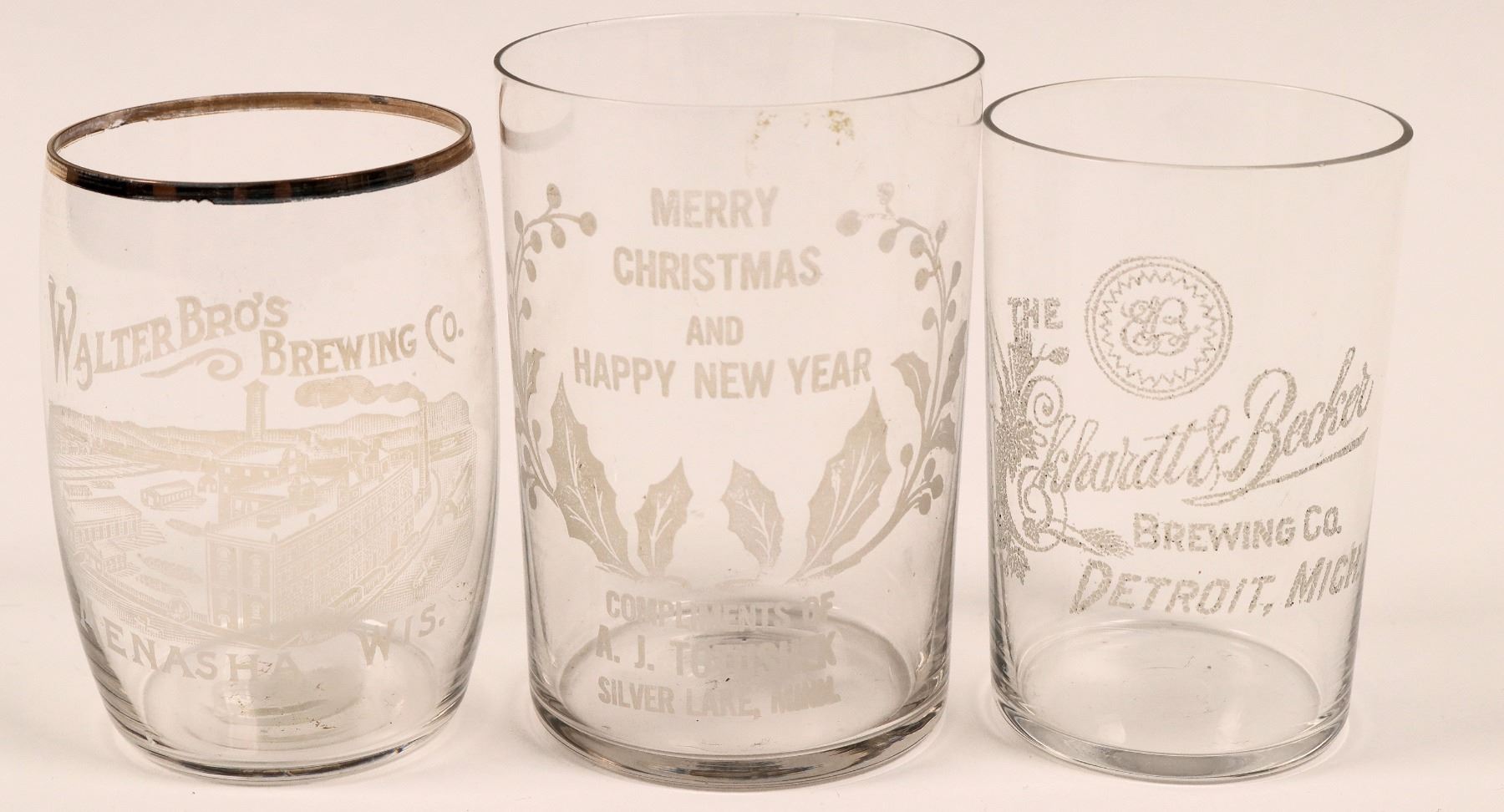 Three thin glass vintage beer glasses: Totushek, Silver LAke, Minn.; Eckahrdt & Becker, Detroit; Walter Vros, Menasha Wis.