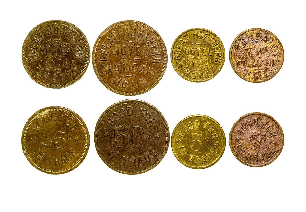 Lot of 4: Three Great Northern Hotel (5, 25 & 50c); One Great Northern Billiard Hall, 5c. City: Mondak State: Montana Date: ID: 36516