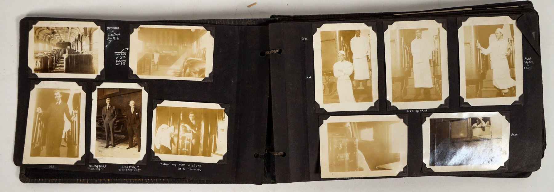 Photo album with approx. 175 photos of various sizes (1.5 x 1.25" to 4 x 6"). Dates 1934-1939. Includes shots of a Great Northern train cars and employees, personal vacation photos, snapshots of FDR visiting Glacier Park, Summit, Montana, 1930s autos, and more. Please inspect. Album is 7 x 11.5"