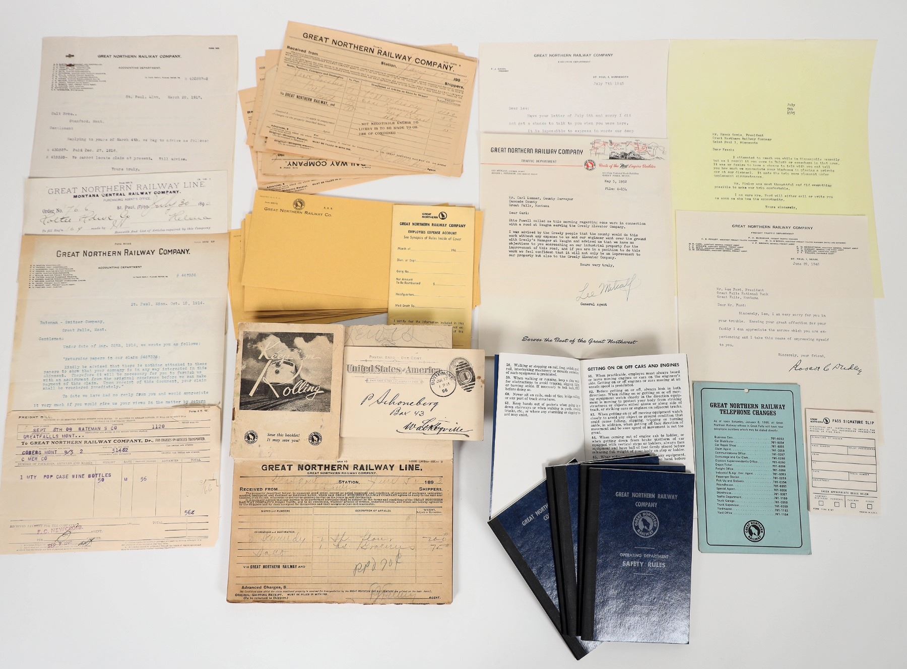 3x Safety Rules 1967.Another Illustrated safety booklet. Pass signature slip pad, several letterheads, unused employee expenses account booklet, 2x telephone card, c. 1893 receipt book, 8x unused business envelopes.