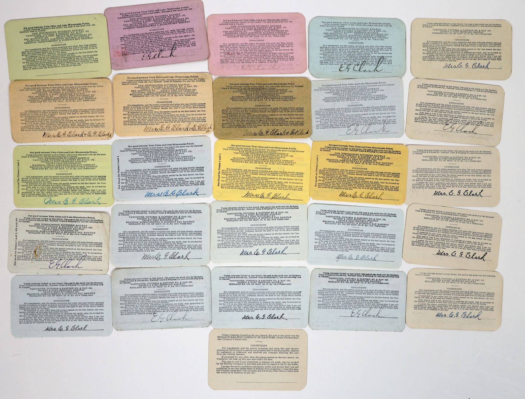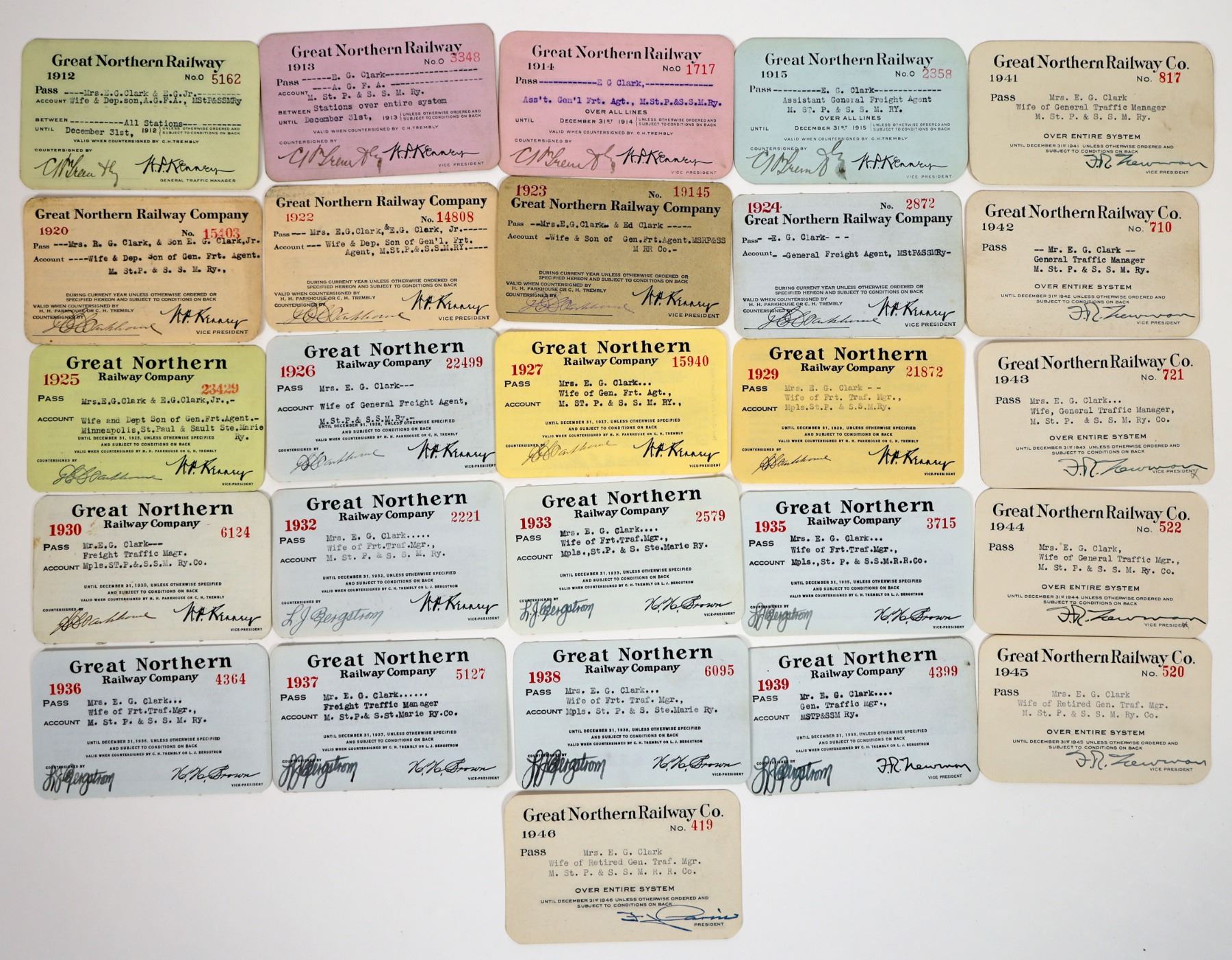 Group of 26 railroad passes from the Great Northern Railway. Passes date from the early 1900s; see photos for specific years and additional detail.