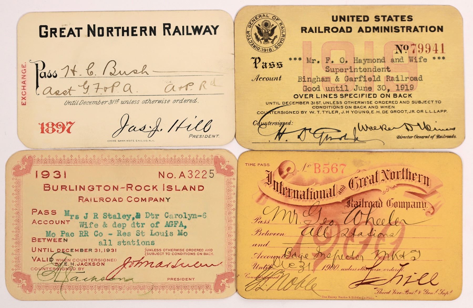 Lot of four railroad passes related to the Great Northern Railway. 1) 1897 Great Northern Railway, issued to H.C. Bush, No. 234, ivory card stock; 2) 1900 International and Great Northern Railroad, No. B567, with imprinted date, light yellow; 3) 1919 United States Railroad Administration issued by the Director General of Railroads, imprinted date; 4) 1931 Burlington-Rock Island Railroad, No. A 3225, ivory card stock. State: City: Date: Provenance: