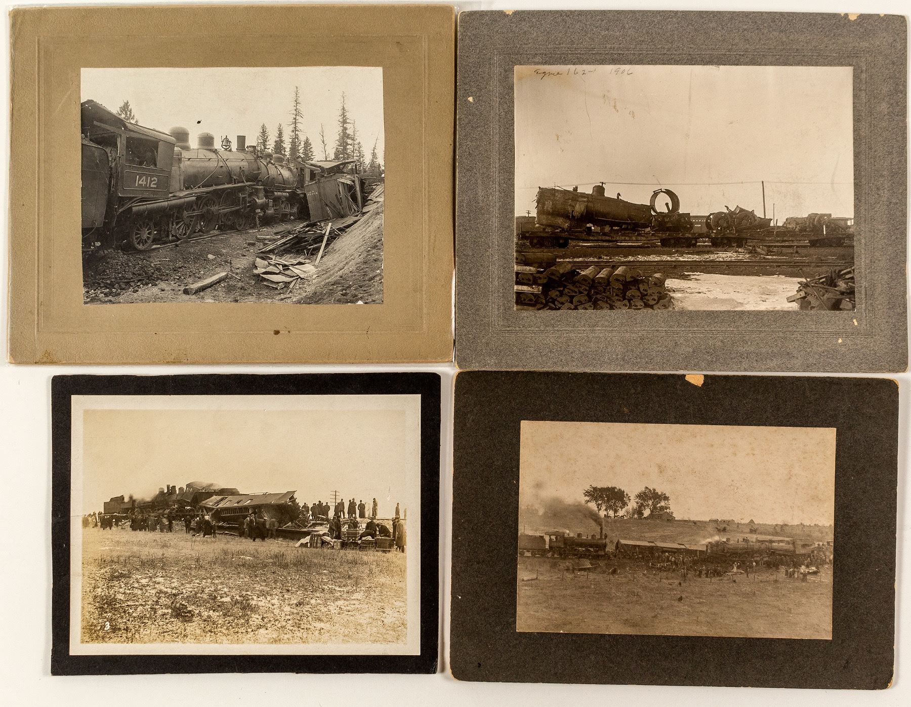 4 Photographs of 2 different train crashes on the Great Northern Railway. Images of wreckage on crash sight and also being hauled away. All mounted on board, approximately 5" x 7" sizes. State: Montana City: HWAC#: 40808 Date: c. 1906