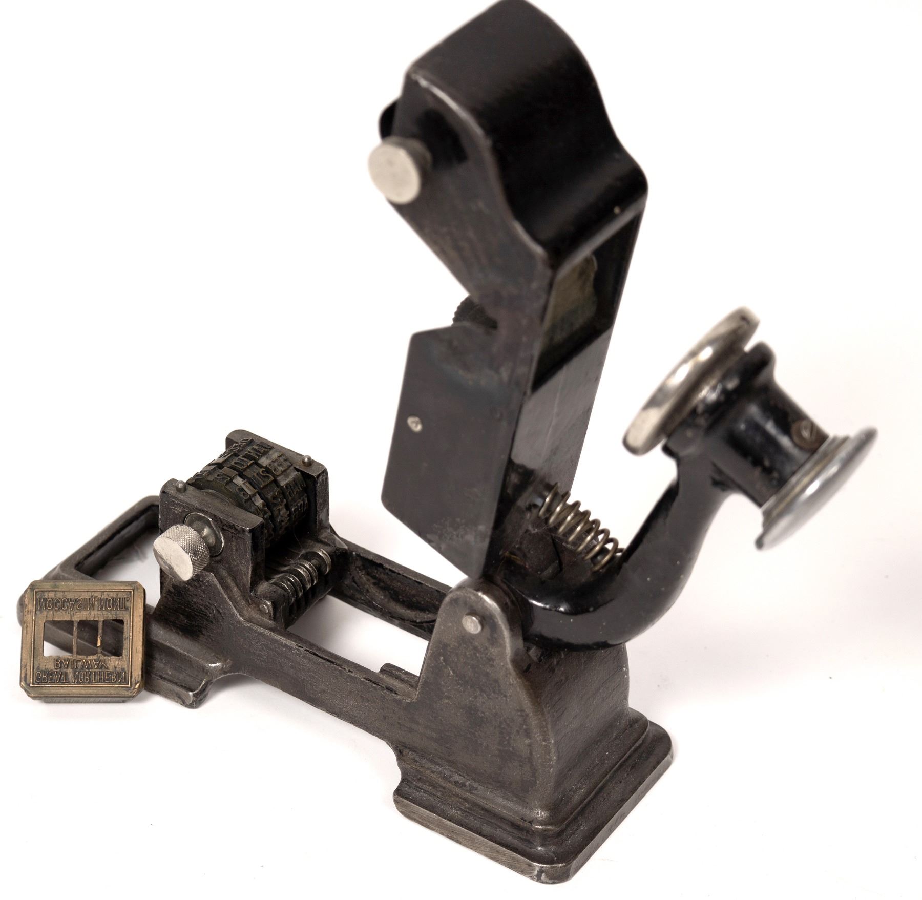 Cast iron punch canceller with Great Northwestern Railway, Moccasin, Mont. ID plate. 5.75x8.25x3".