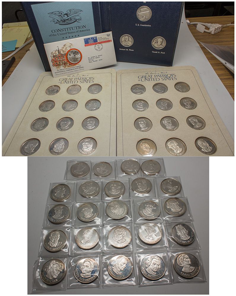 Lot of 3. 1) Danbury Mint. Great Patriots of the United States. Set of 48 sterling silver proofs. Series I and II. Each medal measures 39mm in diameter. Depicts historical figures like Lewis and Clark, Patton, Washington, etc. Some of the rounds have toning and other wear. Half of them have been removed from original folders since folders were falling apart. Case has Gordon Barne Harris in gold lettering. Nice historical set. 2) Danbury Mint. Democracy in Action: a commemoration of the orderly transition of Presidential power of August 8-9, 1974. Three sterling rounds: U.S. Constitution, Gerald R. Ford, and Richard M. Nixon. Comes in attractive blue binder with a copy of the U.S. constitution. 3) 1974. Franklin Mint. The Official First Continental Congress Bicentennial Medal and Cachet. One sterling silver proof in cachet cover addressed to Gordon Harris. Nice blue presentation binder. From the Gordon Harris estate.City: County: State: Date: