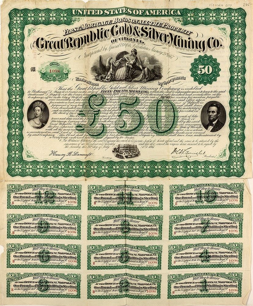 This is a rare piece of Nevada mining history! The company operated five gold and silver mines in Nevada. 1867 issued for 50 pounds. Not cancelled. Green border and vignettes of Lincoln and Queen Victoria, as well as a larger vignette of Lady Liberty with an eagle. Twelve coupons attached. Printed by Continental Bank Note Co. in New York. 15.5" x 13" with folds, tape repairs and rips to edges. (Prag Collection). City: State: Nevada Date: 1867 ID# 34448