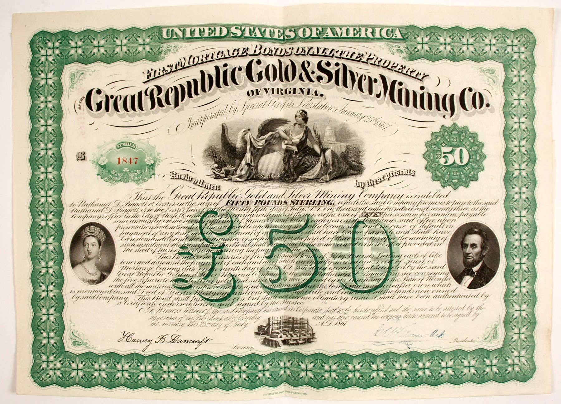 Rare certificate. Operated gold and silver mines in Nevada. #1847. 50 pound bond. 15.5" x 13" Heavy folds as you find in bonds, but no intersection tears, no edge of corner issues. Color is vibrant. Twelve attached coupons worth 1 pound and fifteen shillings sterling each, with redemption dates from Jan 1874 to July 1879. Vignette of allegorical woman with eagle, flag, and U.S. Capitol in the background at center top; Queen Victoria at lower right; Abraham Lincoln at lower left, and smelting machinery at center bottom. This first mortgage bond paid 7 Per Cent, with principal payable on July 25th, 1873. Printed by the Continental Bank Note Co., New York. Although this company reputedly operated several gold and silver mines in Nevada, their location could not be verified. Prag Collection