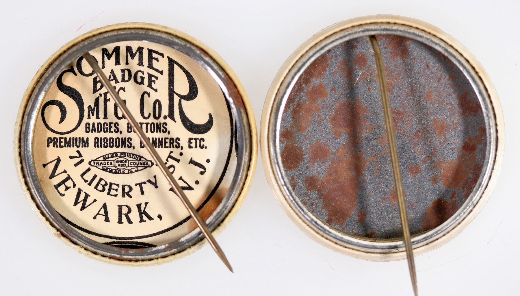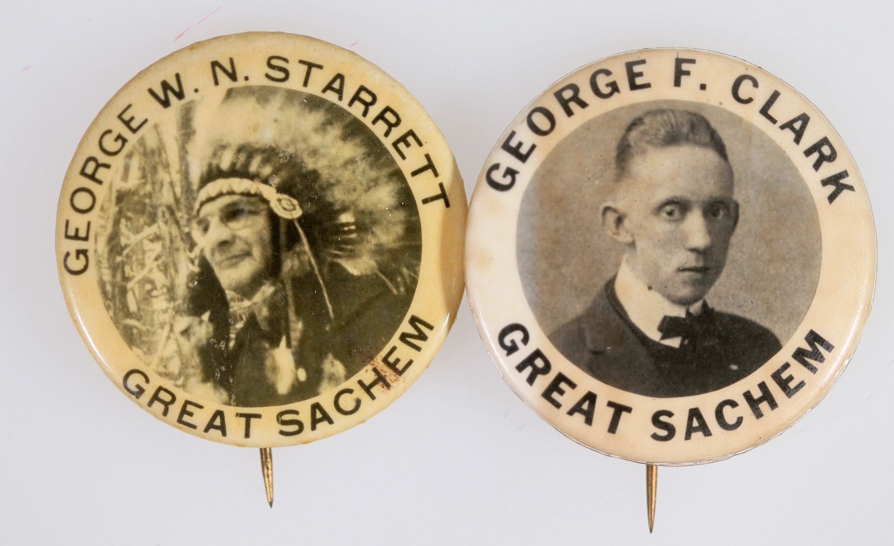 Lot of 2. Great Sachem, high ranking Chief of Native American tribes, pinbacks. . George W.N. Starrett made by Sommer Badge Co. Newark N.J. and George F. Clark, Unk. manufacturer. . Both pins have photo of the individuals. Measure 1 3/4" dia. Both are complete and in very good cond.
