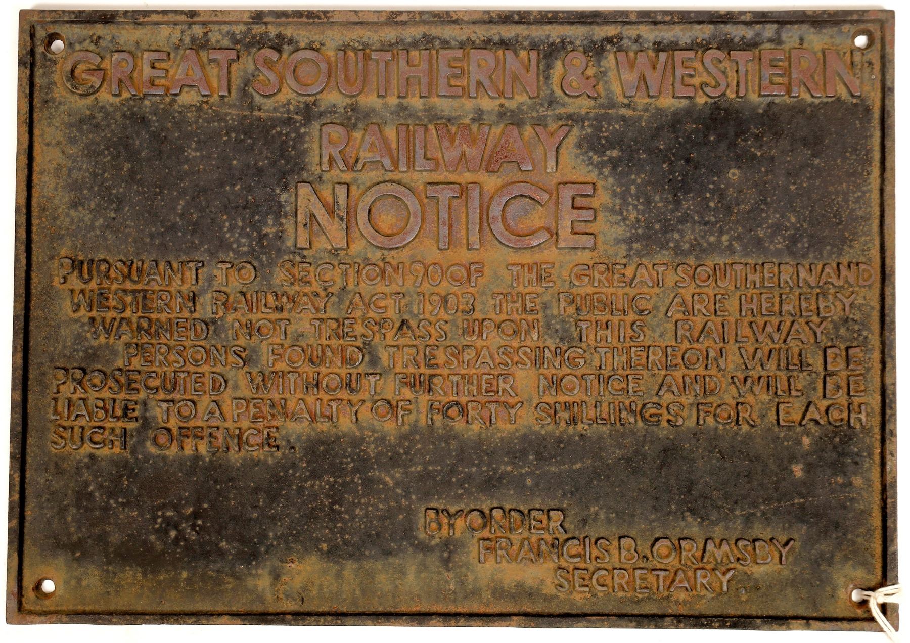 Cast iron sign from the Great Southern & Western Railway (GS&WR) NOTICE sign against trespassing. The fine is listed as "forty shillings for each such offence." So, stay off the tracks, lads! The GS&WR operated in Ireland from 1844 to 1924 and grew from both construction and mergers with smaller lines. In its later years, the railway was the largest railway network in Ireland with about 1.800 km of track. In 1924, the line was merged many other lines within Ireland to become The Great Southern Railways. These were further combined in 1945 to create the Irish State Transport Company which was nationalized in 1950. The railways now operate as Irish Rail. They are still heavily in use. Sign is about 15.25 x 10.75 x 0.25 inches and weighs about 8.8 pounds. Letters are well formed and undamaged, but the surface has a patina of rust. There are four mounting holes, one in each corner. See photo for condition details. All ABOARD!