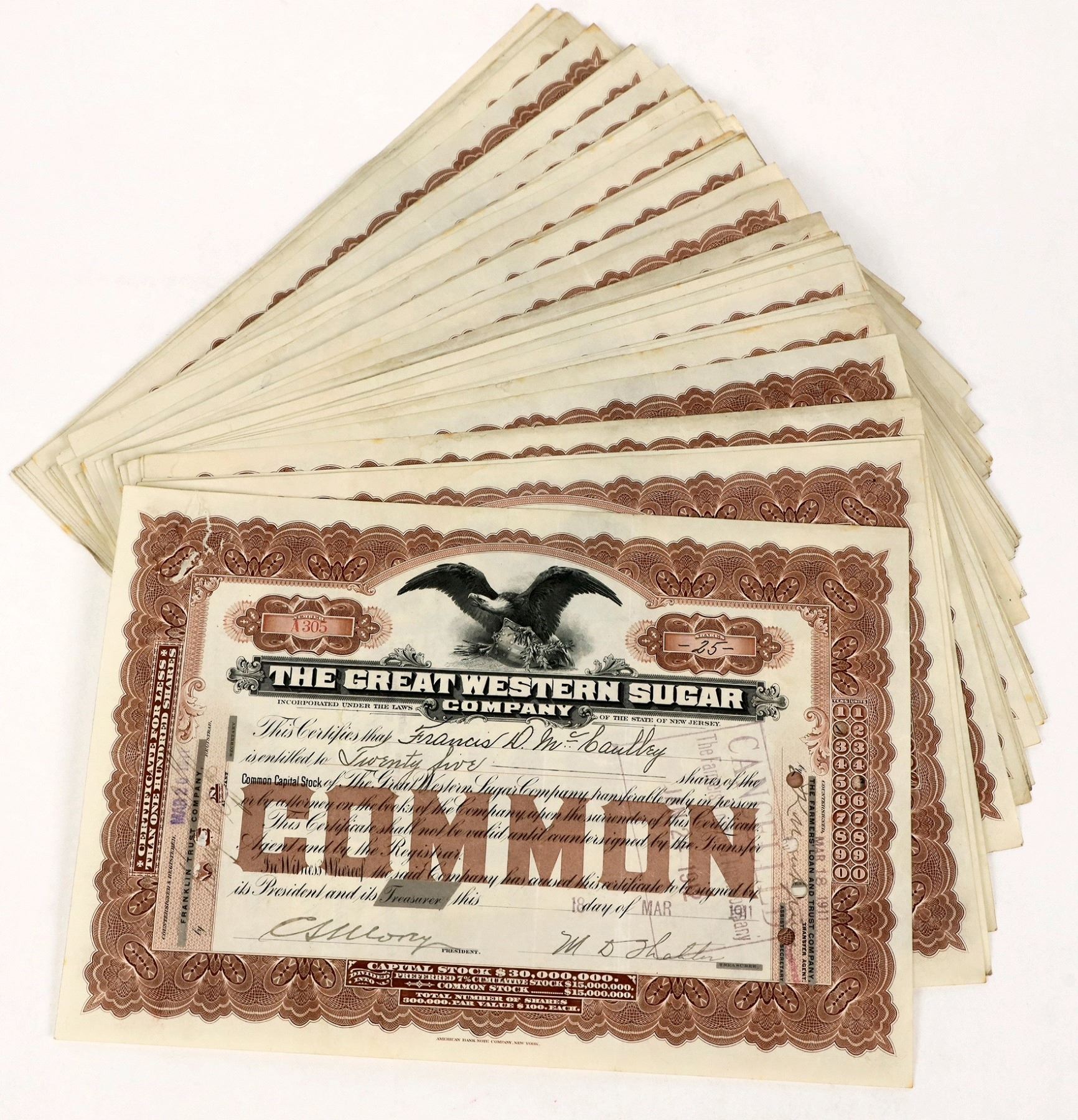 There are 90 stock certificates for the Great Western Sugar Company dated 1911. All are on brown ink and eagle vignette. Please see photo for details.